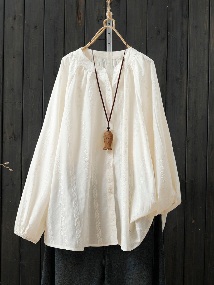 Women Spring Artsy Embroidery Cotton O-Neck Shirt