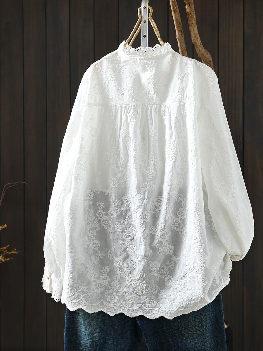 Women Spring Artsy Flower Embroidery 100%Cotton Shirt