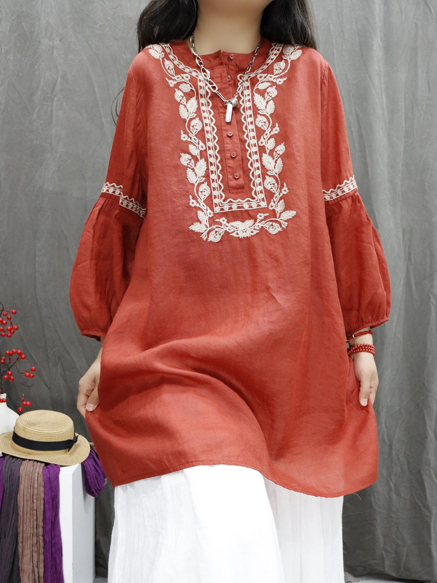 Women Spring Artsy Flower Embroidery 100%Ramie O-Neck Shirt