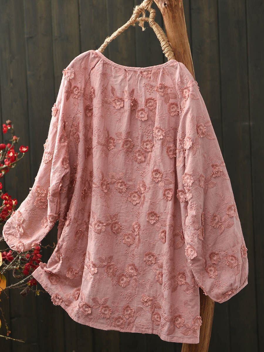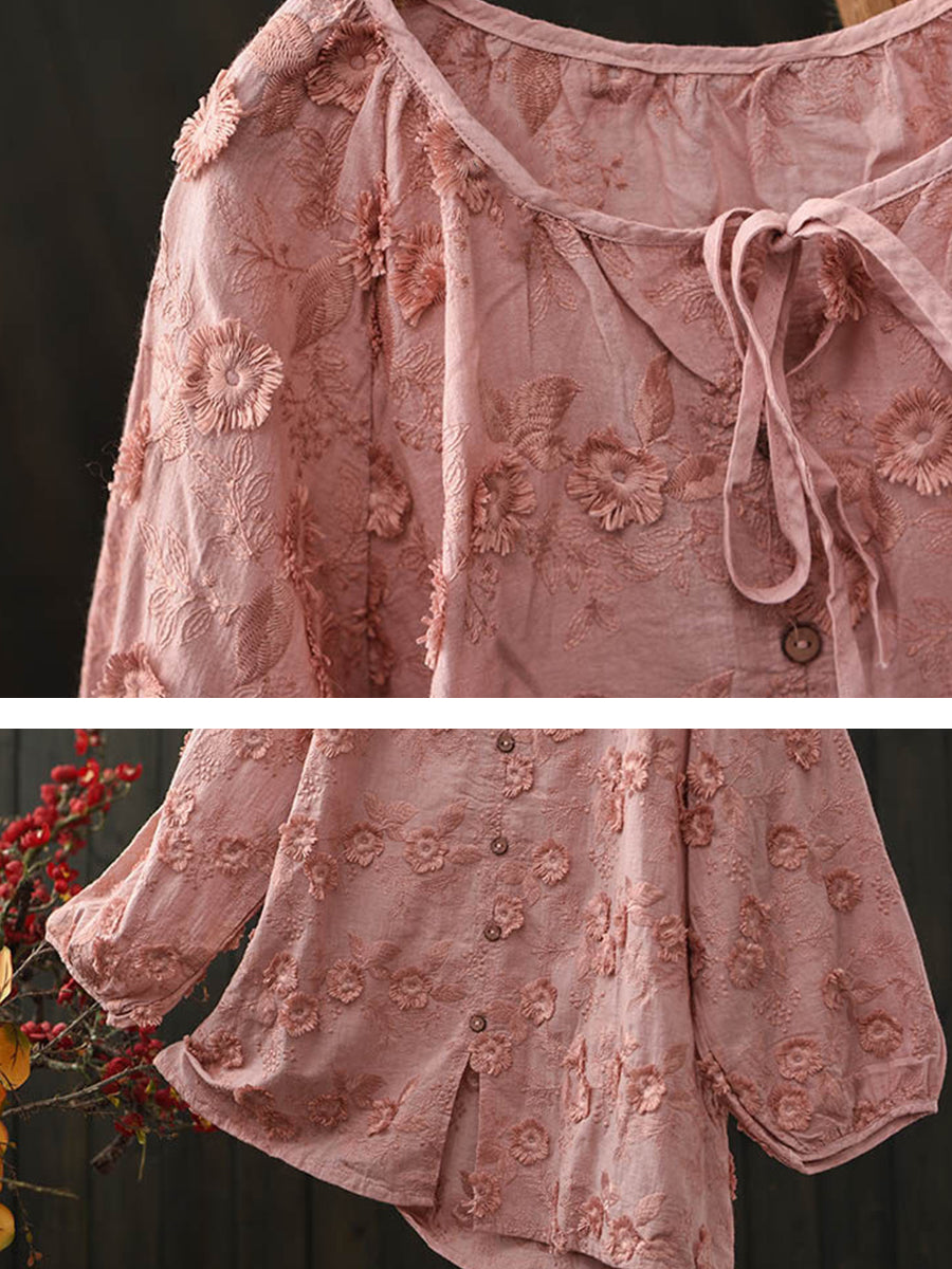 Women Spring Artsy Flower Embroidery Cotton Blouse