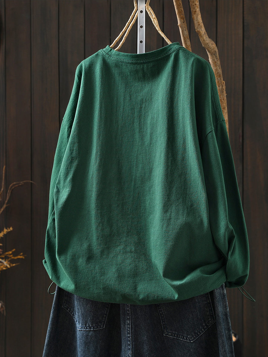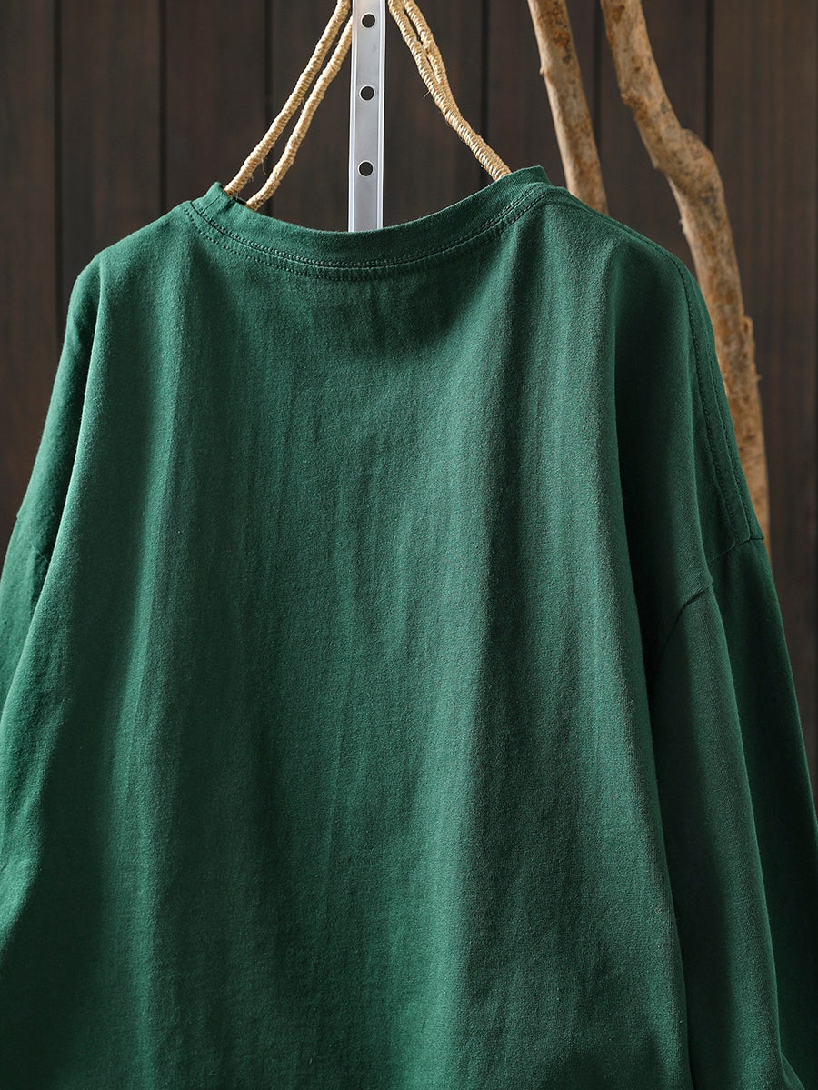 Women Spring Artsy Flower O-Neck 100%Cotton Blouse