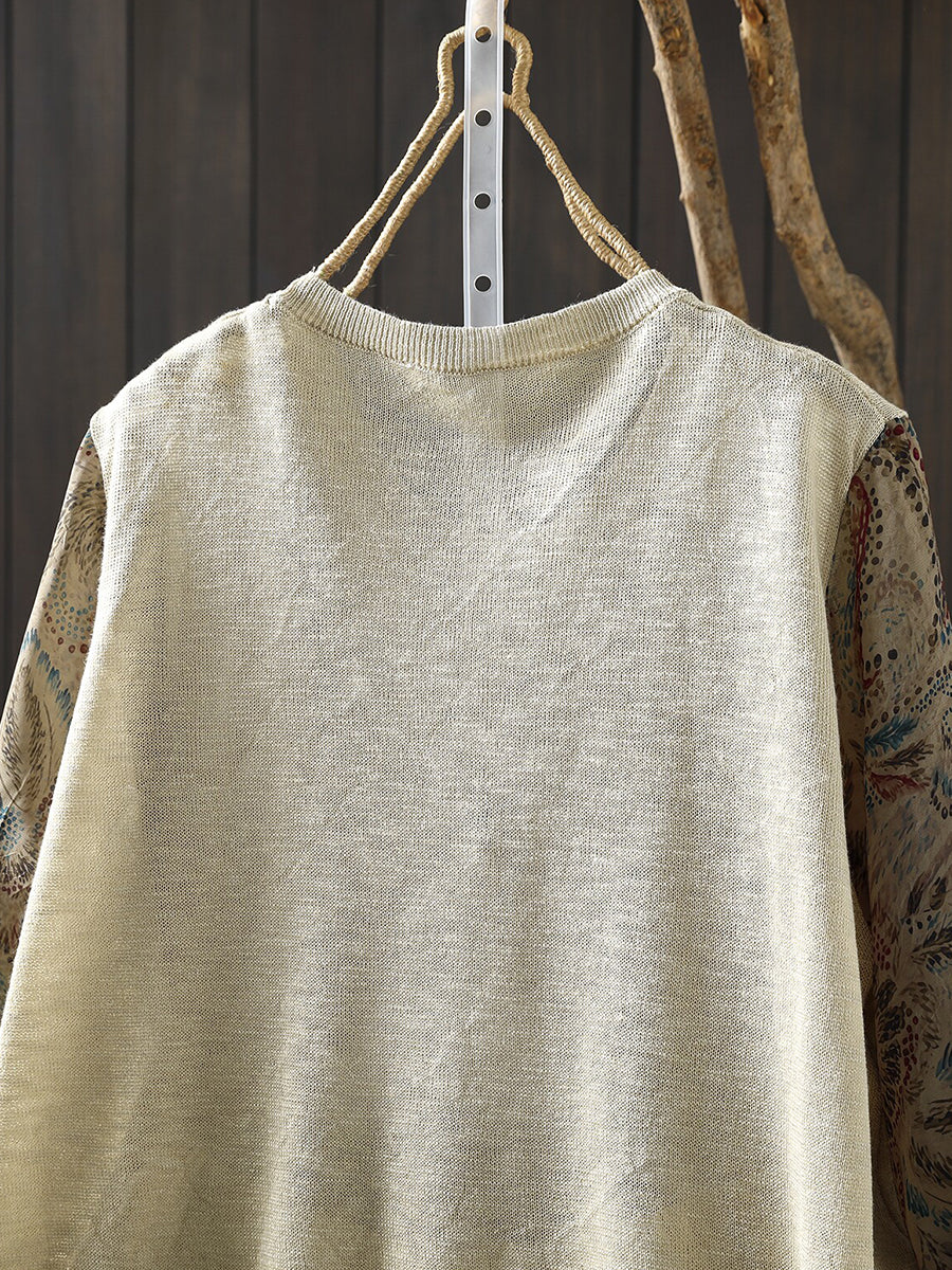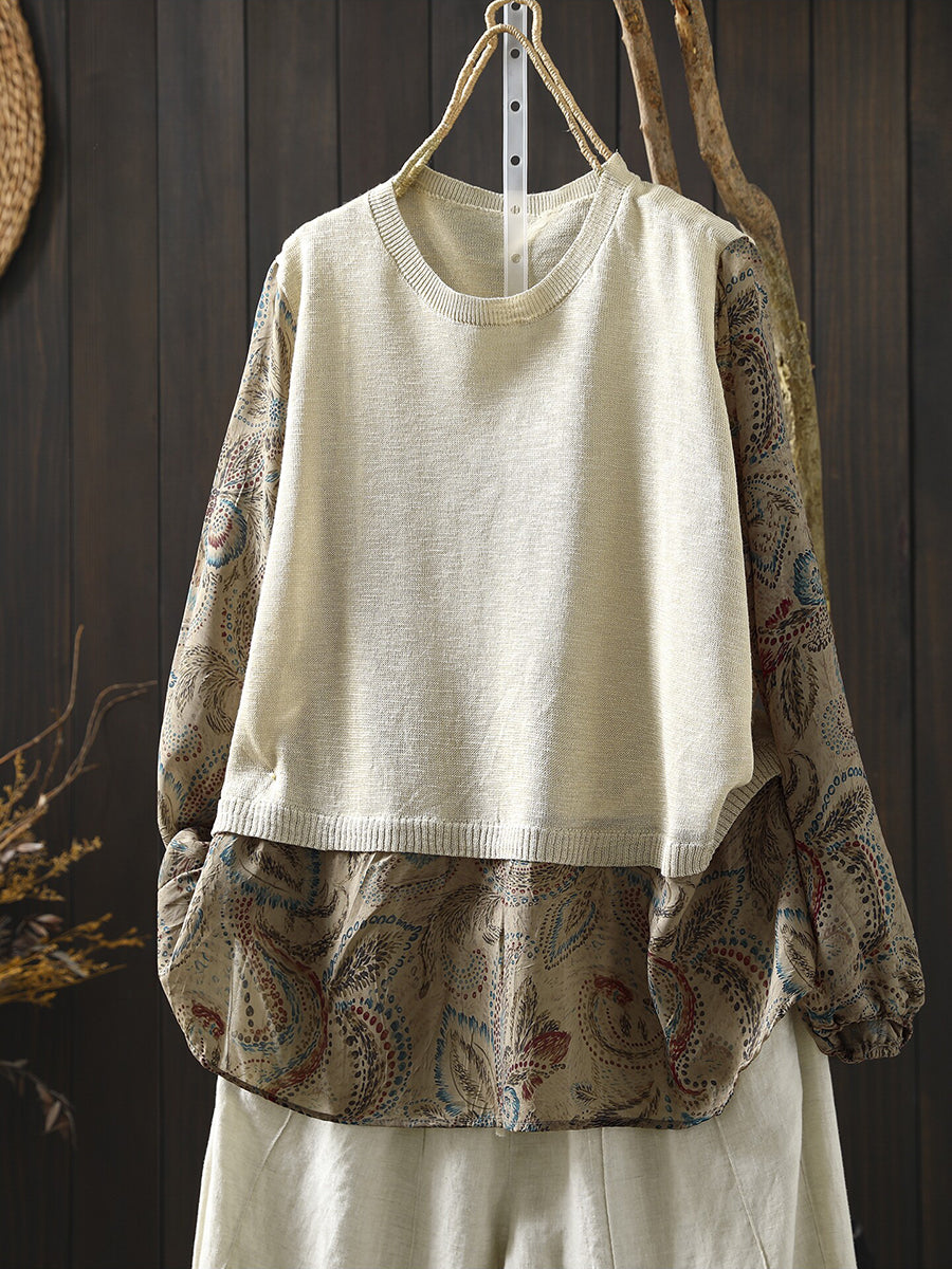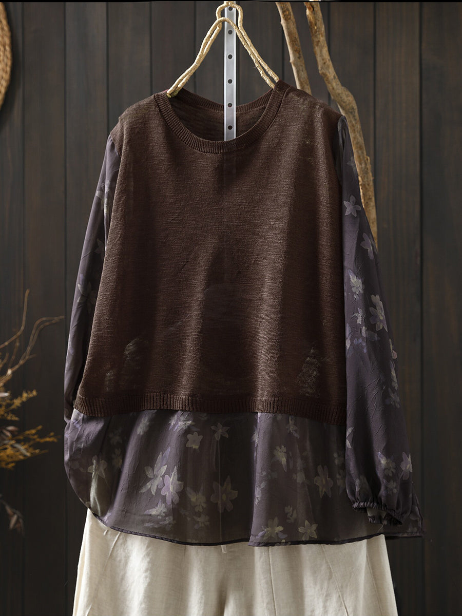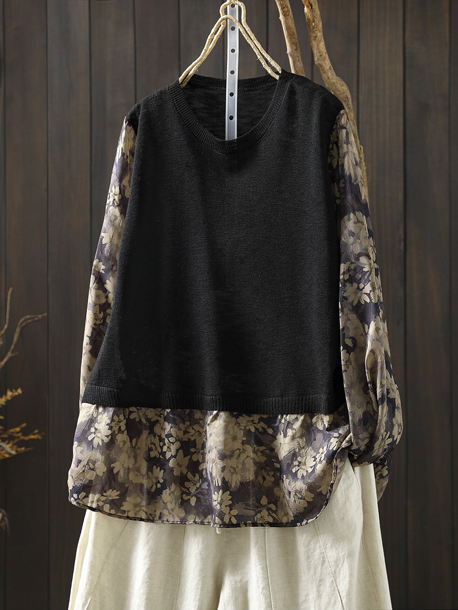 Women Spring Artsy Flower Spliced Cotton Blouse