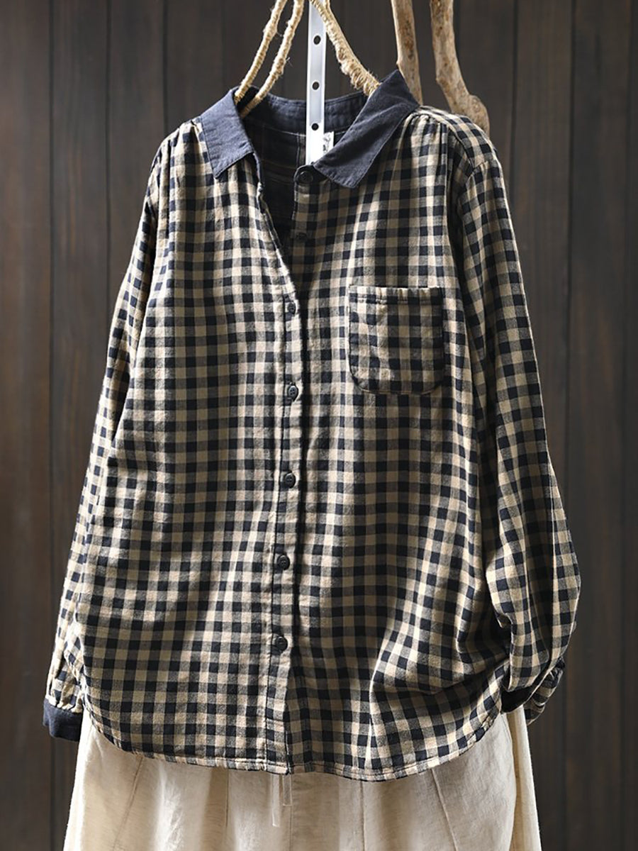 Women Spring Artsy Plaid Colorblock 100%Cotton Shirt