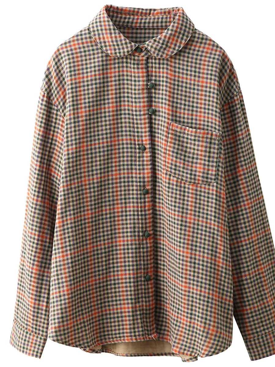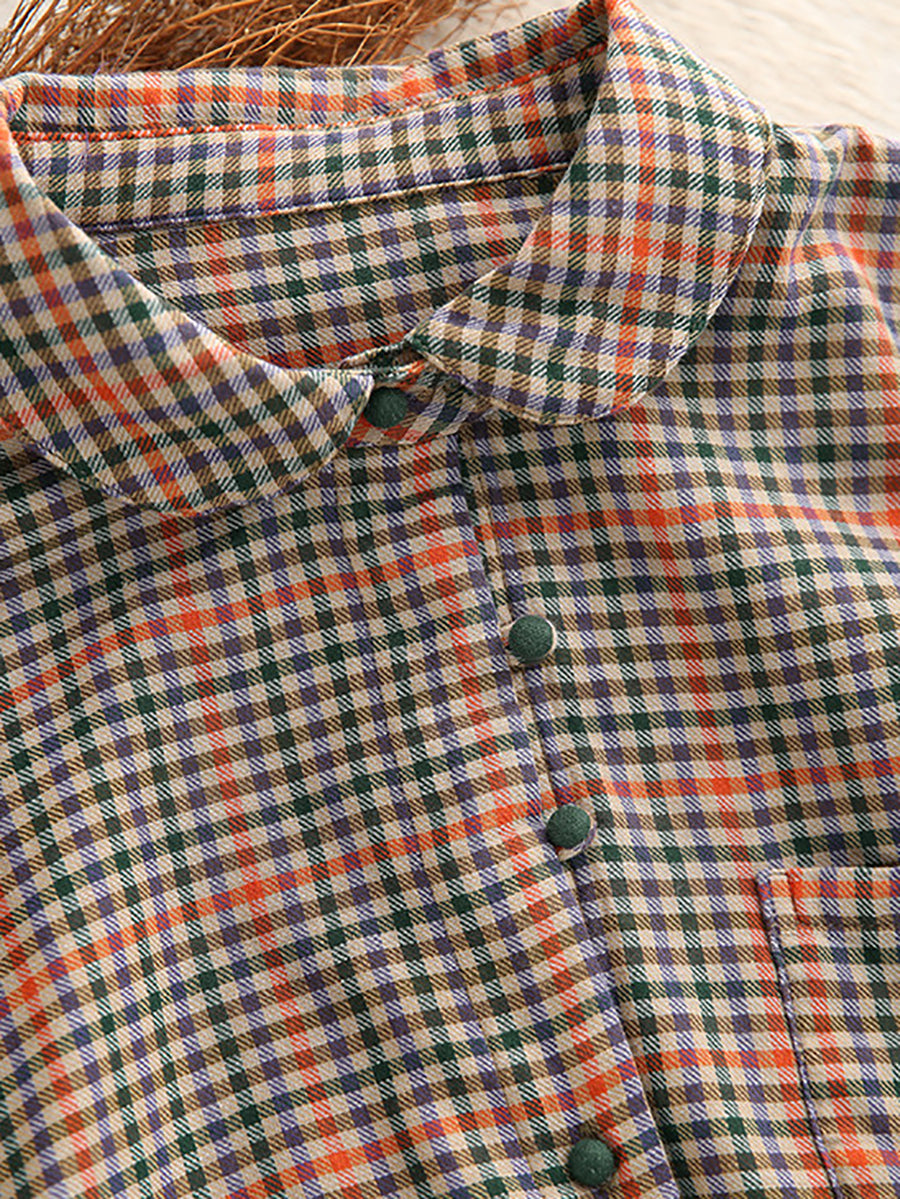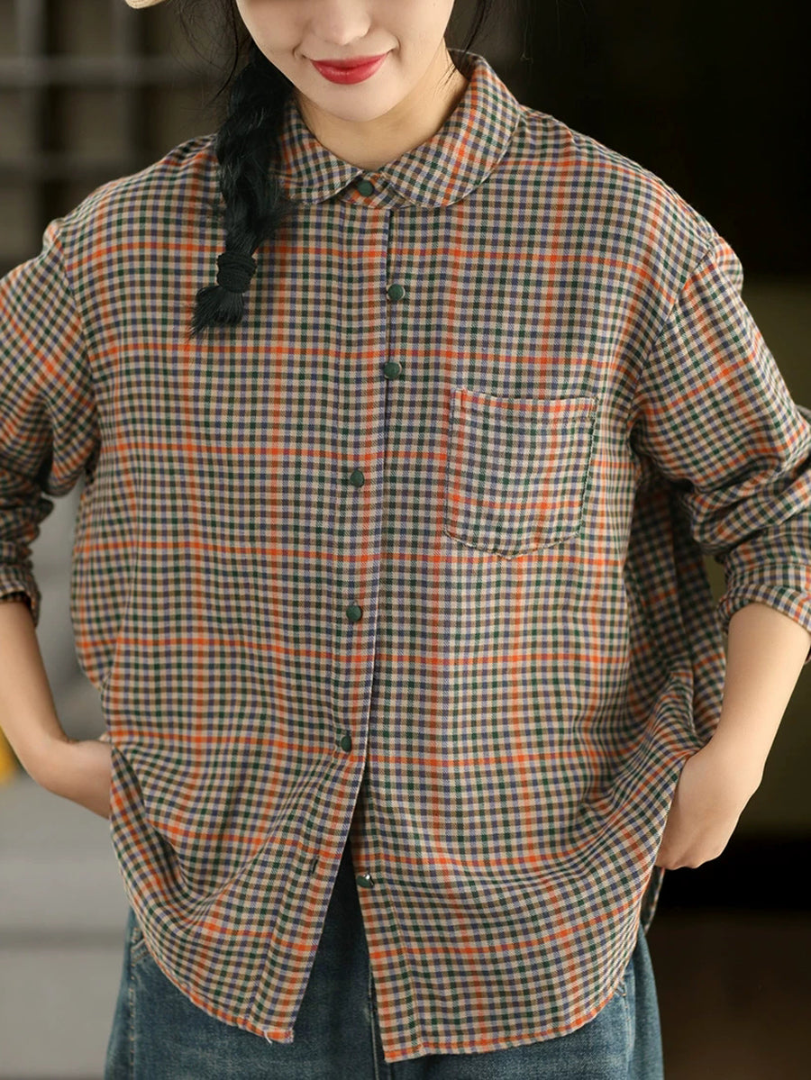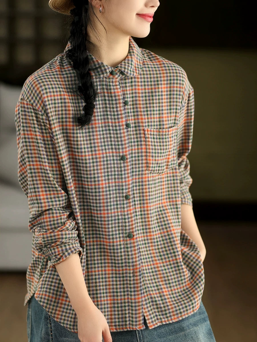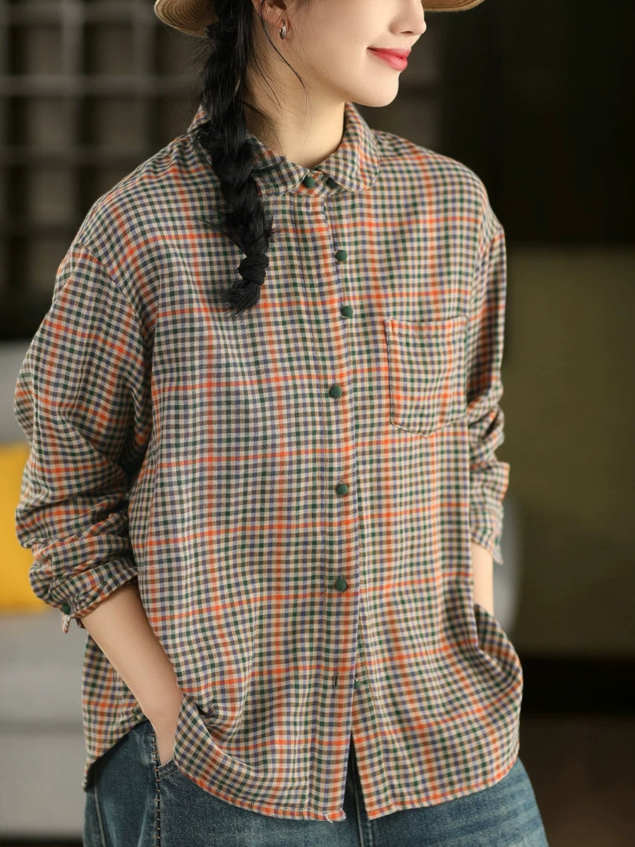 Women Spring Artsy Plaid Stand Collar 100%Cotton Shirt