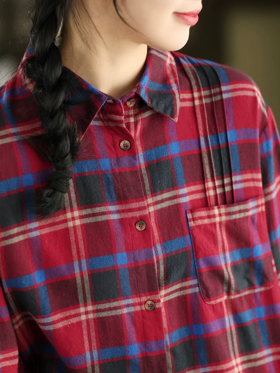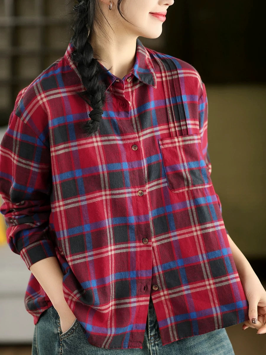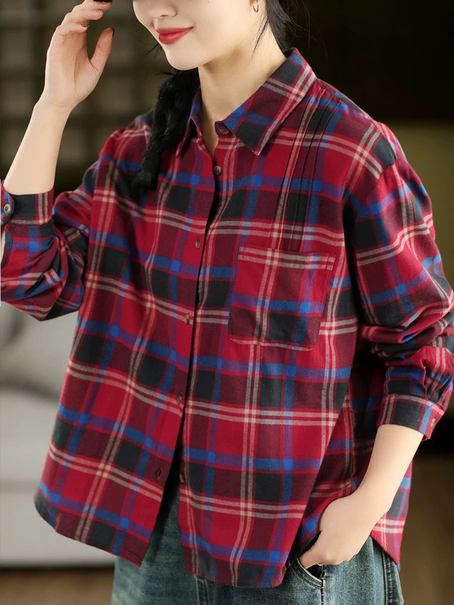 Women Spring Artsy Plaid Turn-down Collar Shirt