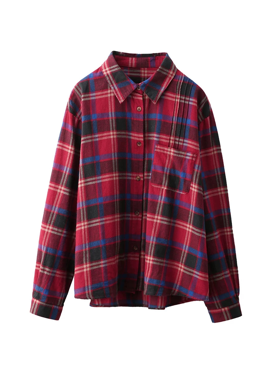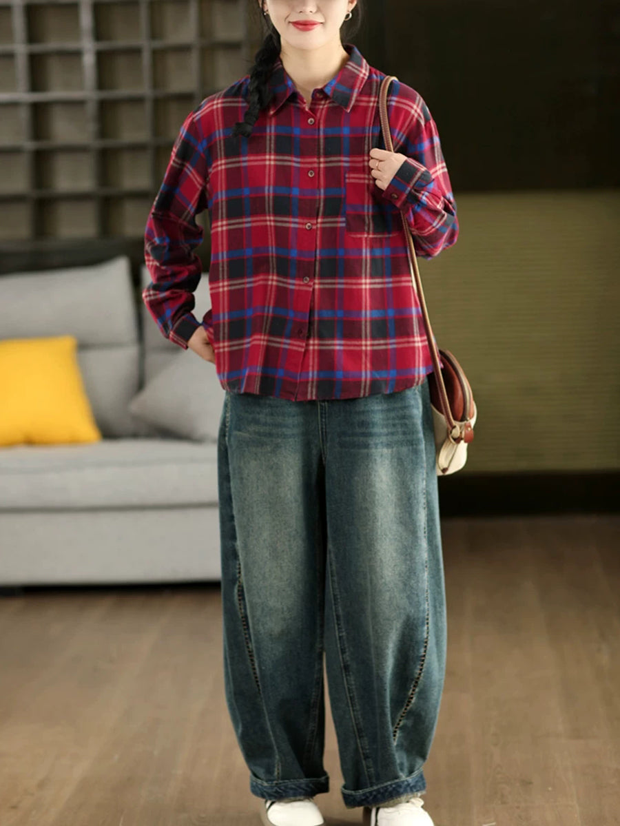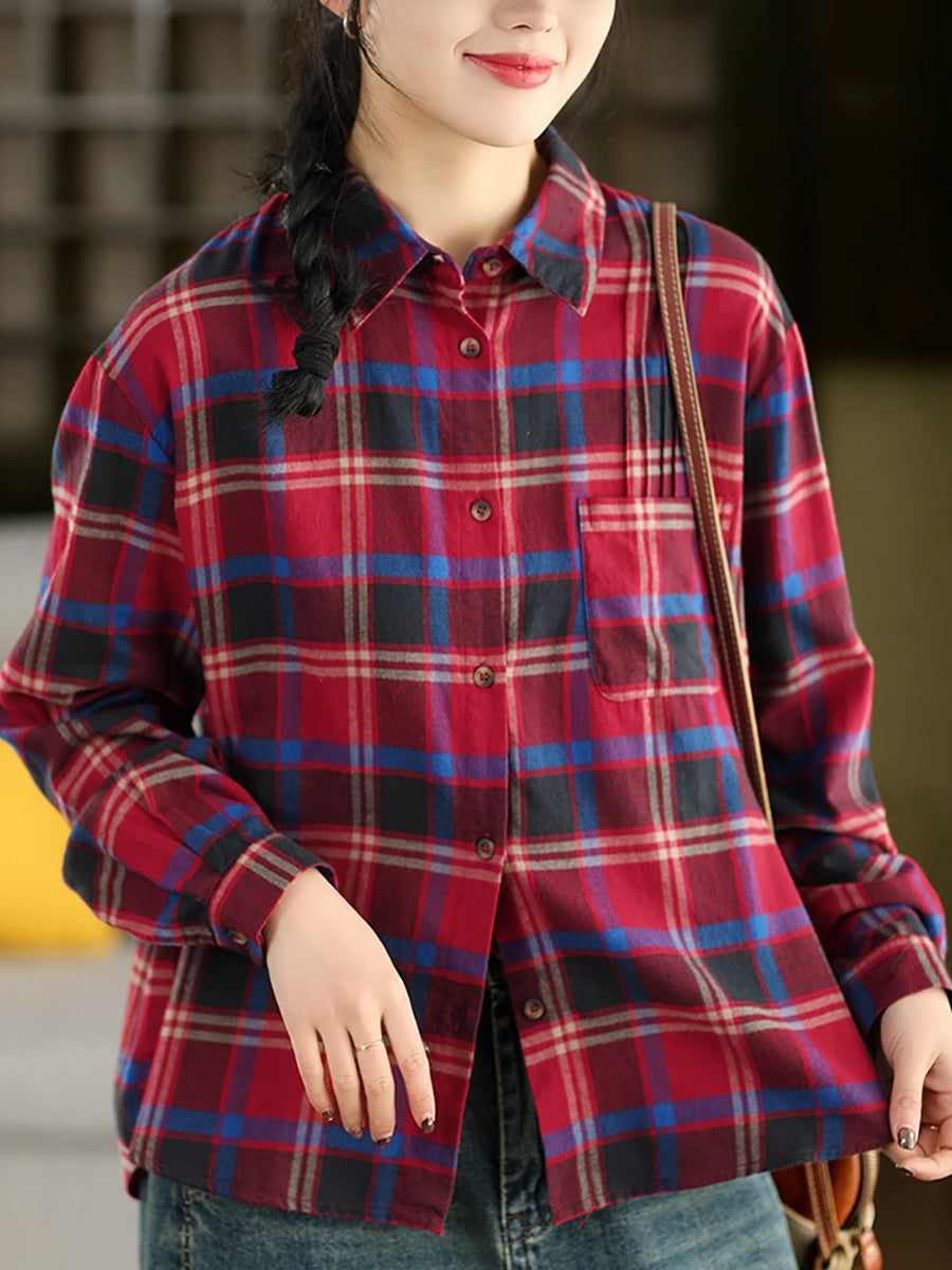 Women Spring Artsy Plaid Turn-down Collar Shirt