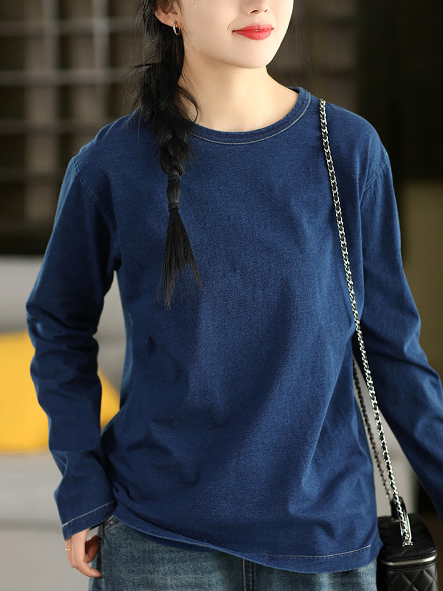 Women Spring Artsy Pure Color 100%Cotton O-Neck Blouse