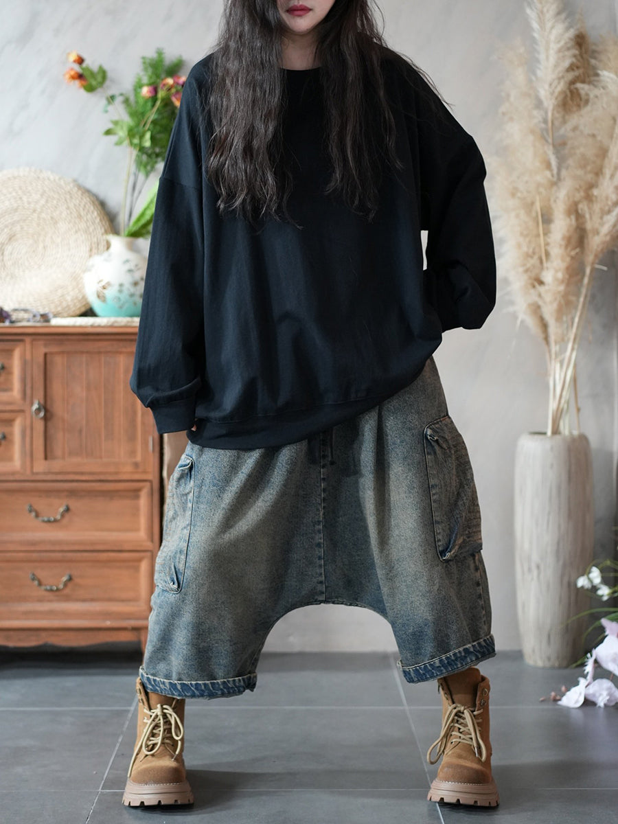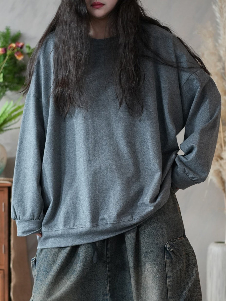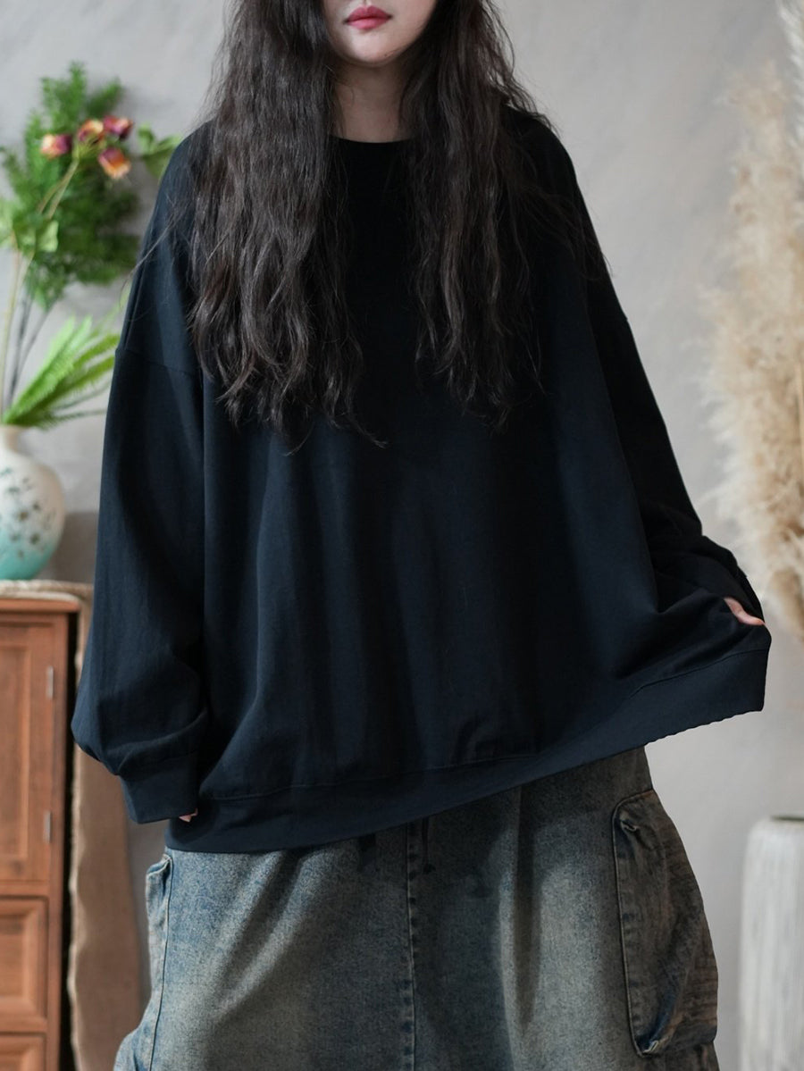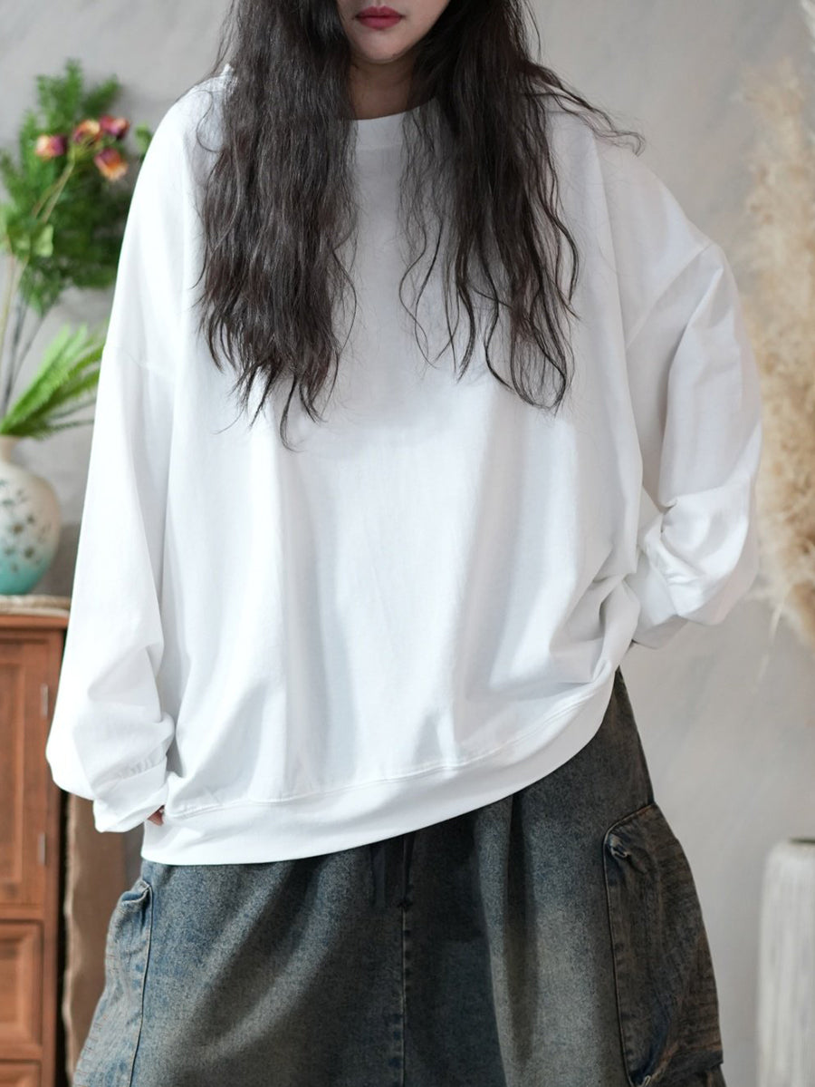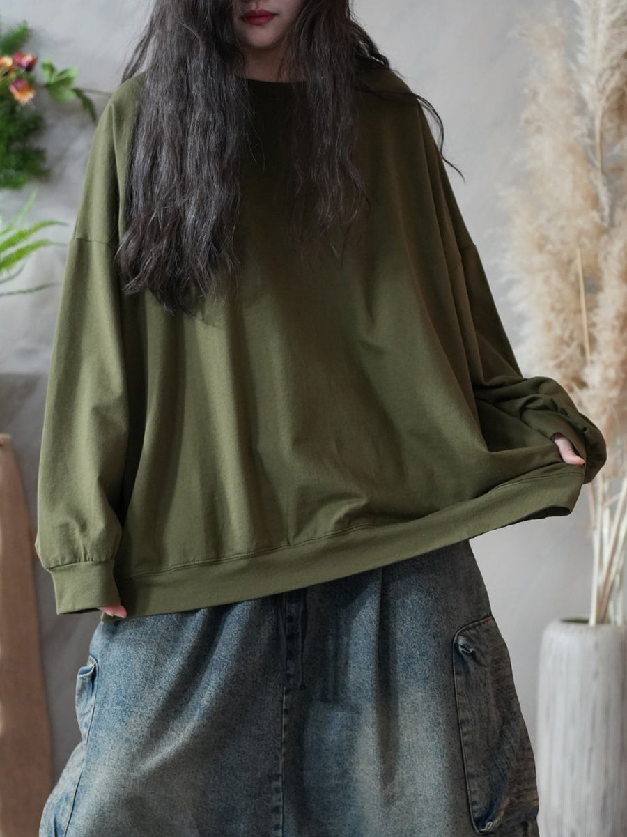 Women Spring Artsy Pure Color 100%Cotton O-Neck Blouse
