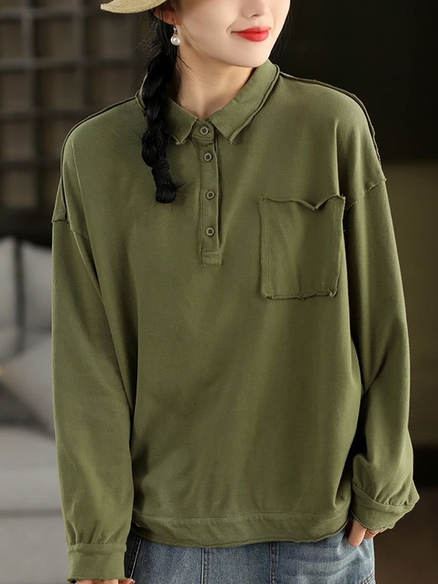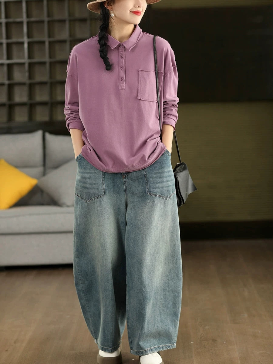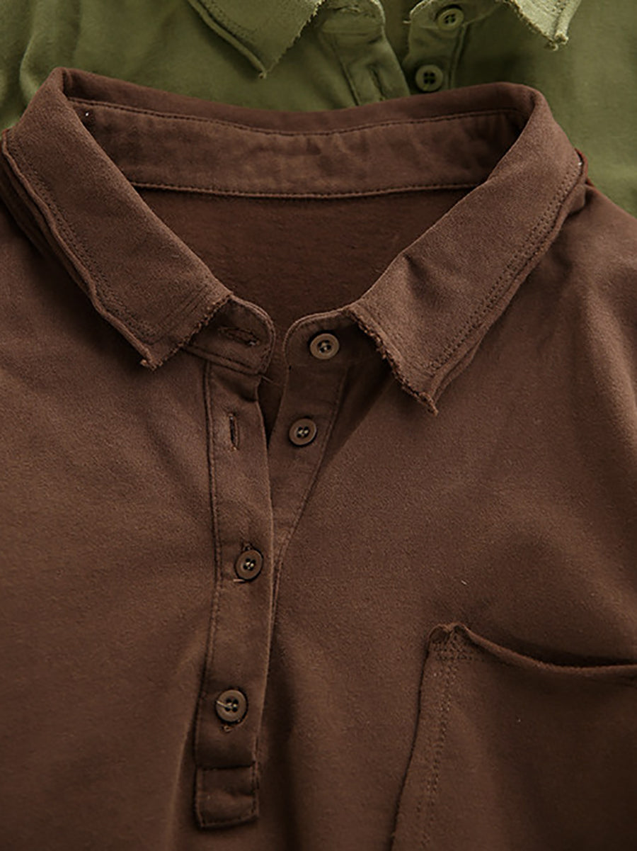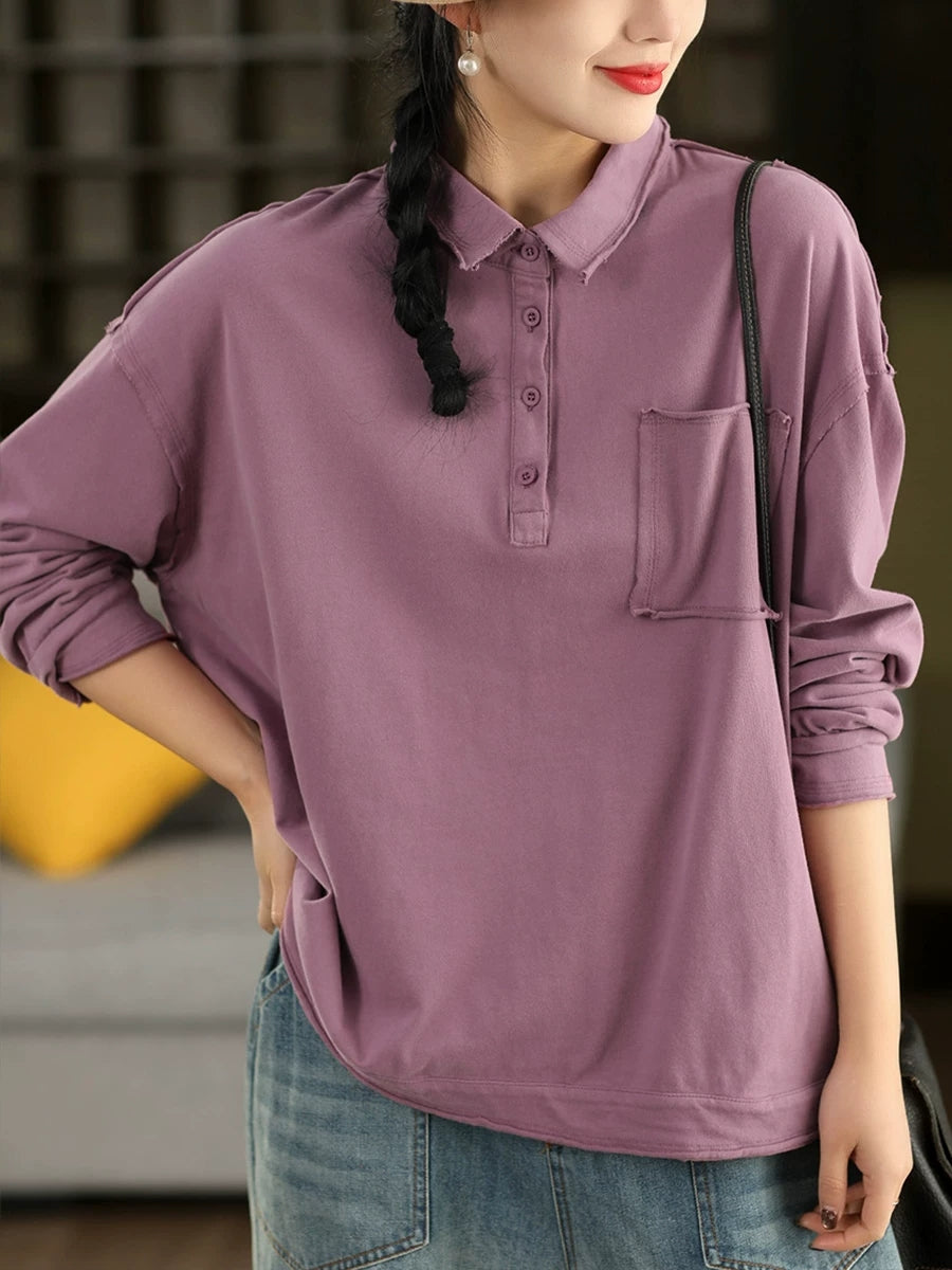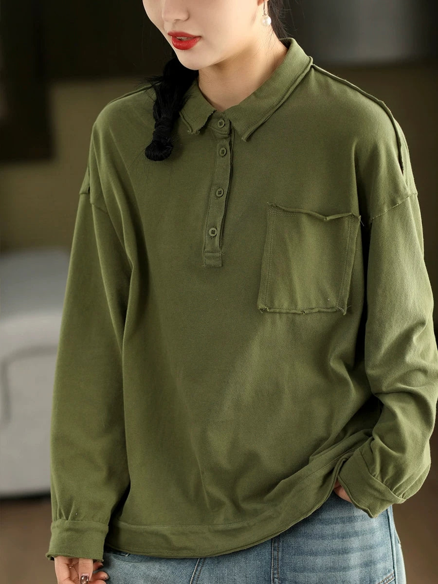 Women Spring Artsy Pure Color Cotton Turn-down Collar Blouse