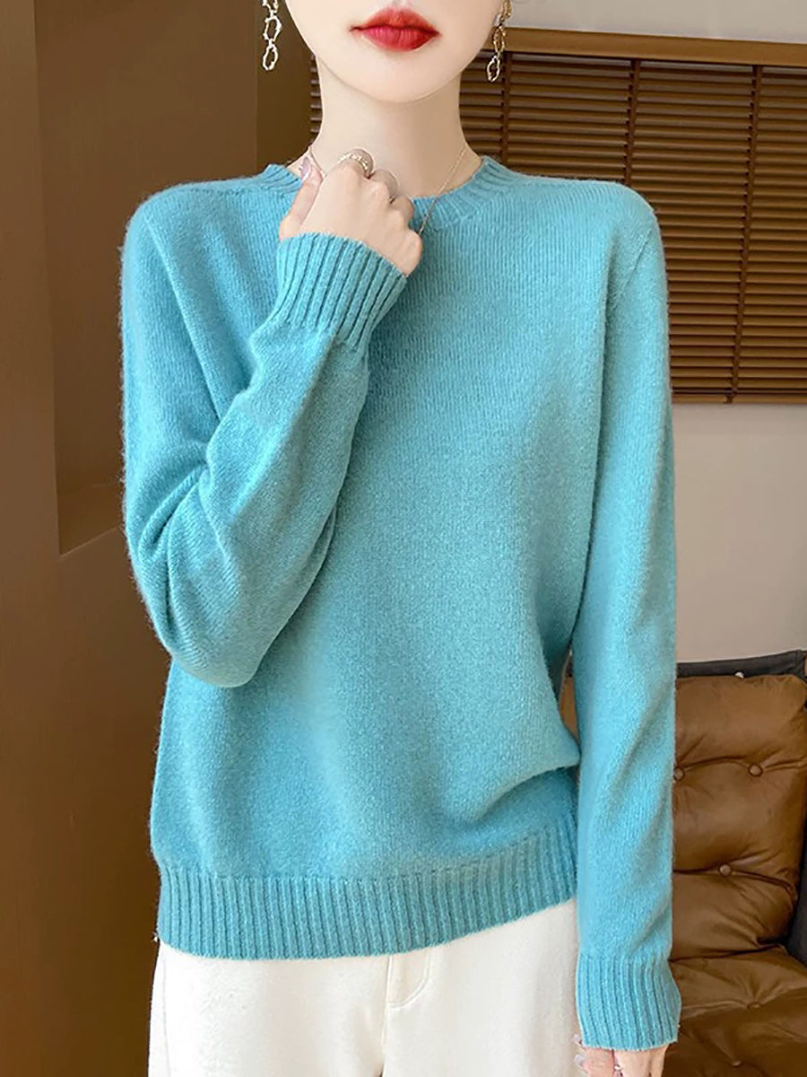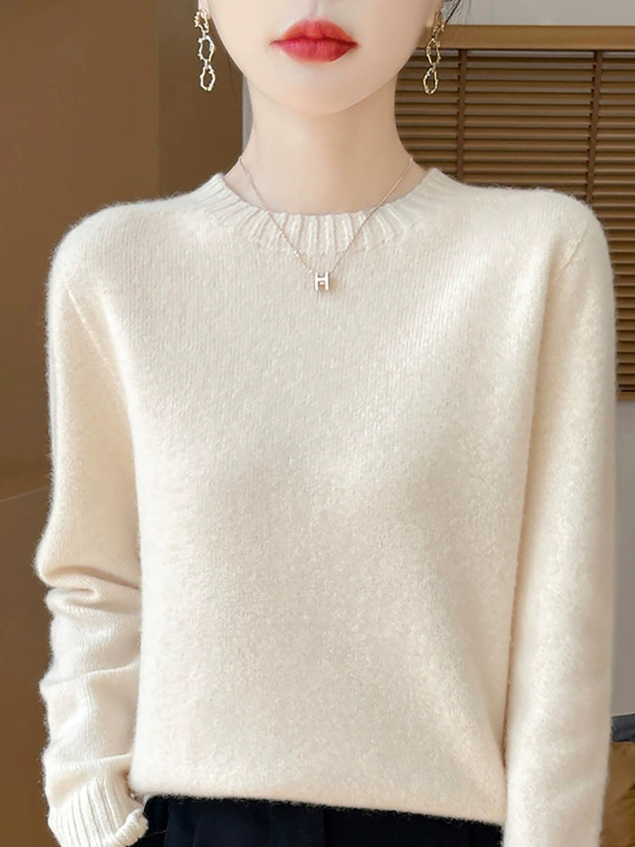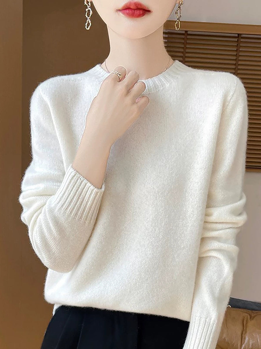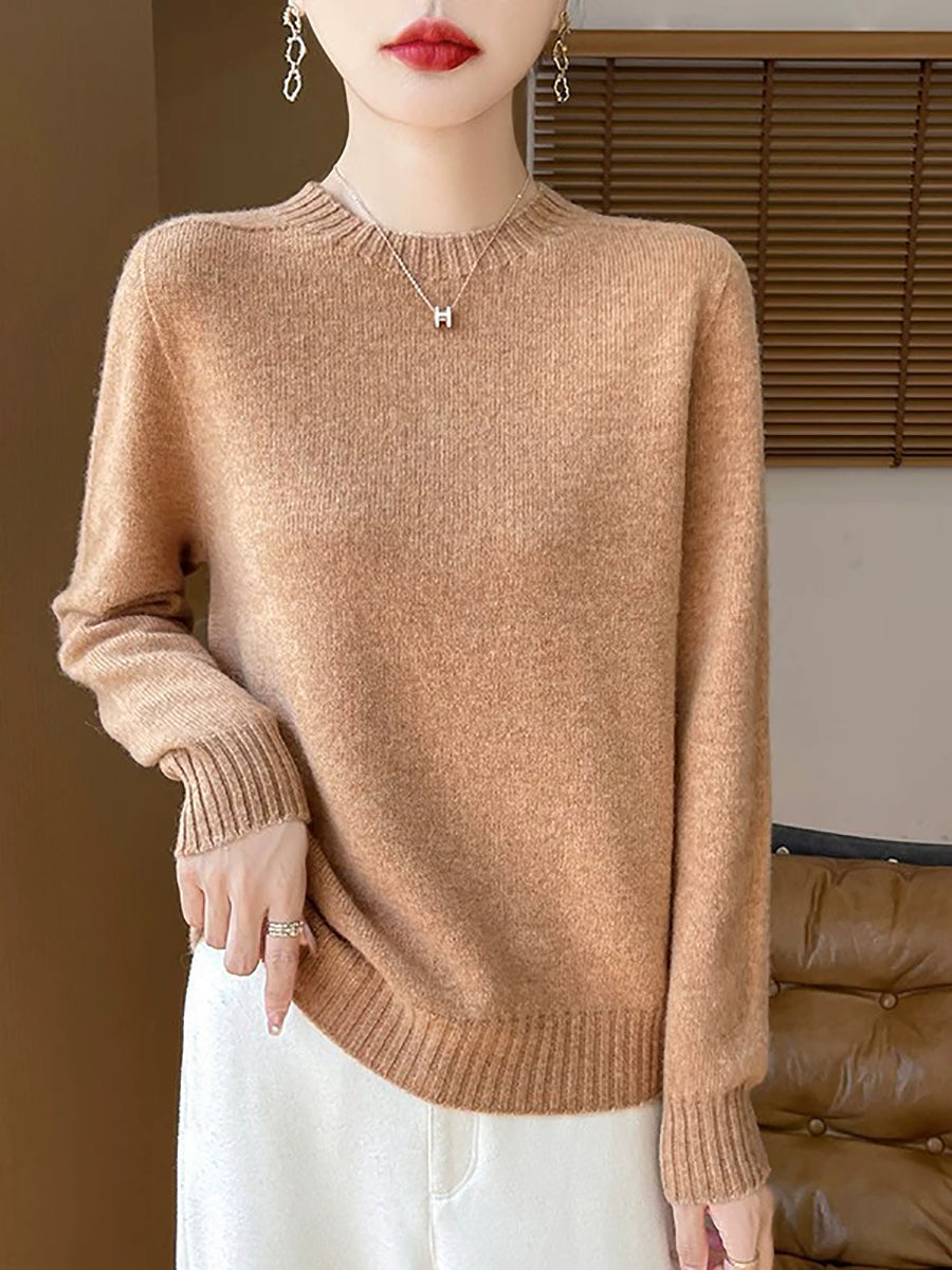 Women Spring Artsy Pure Color O-Neck Wool Sweater