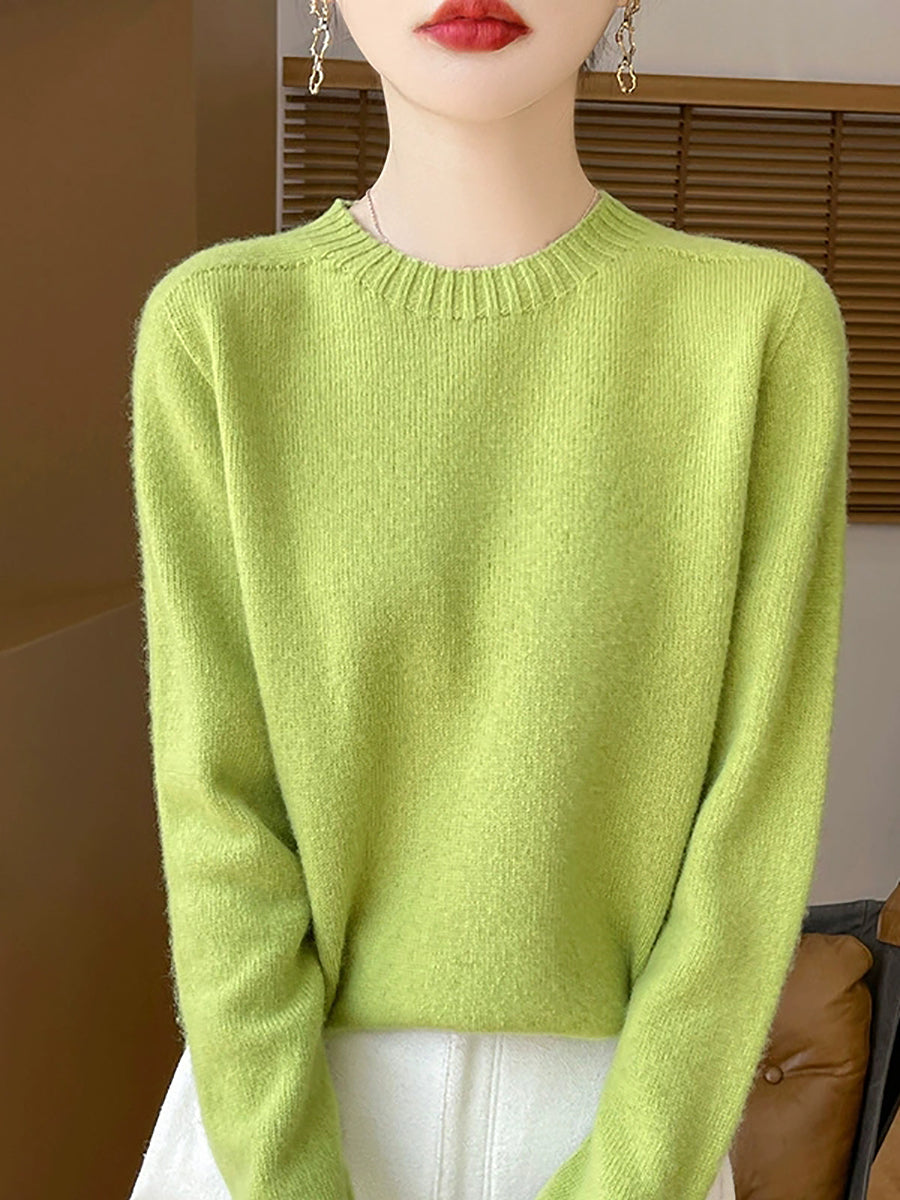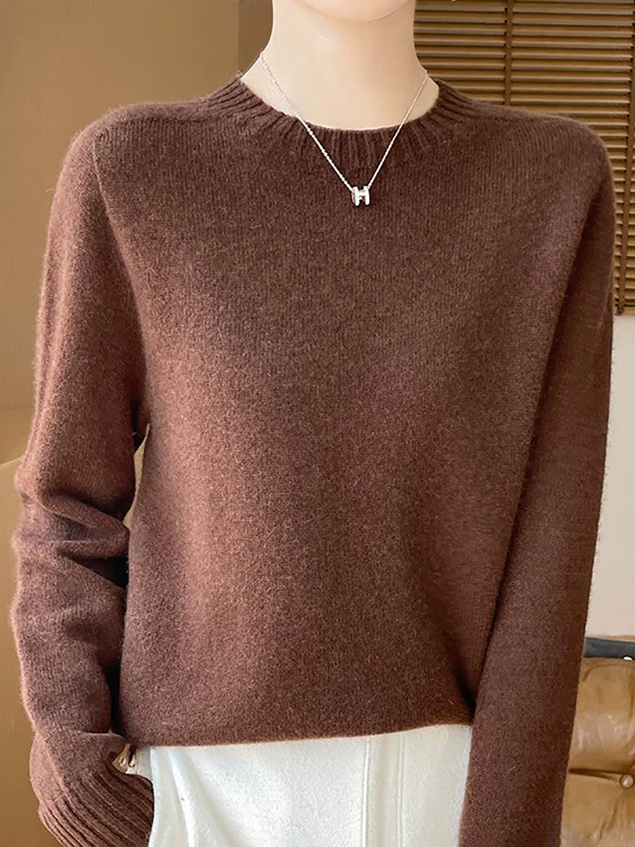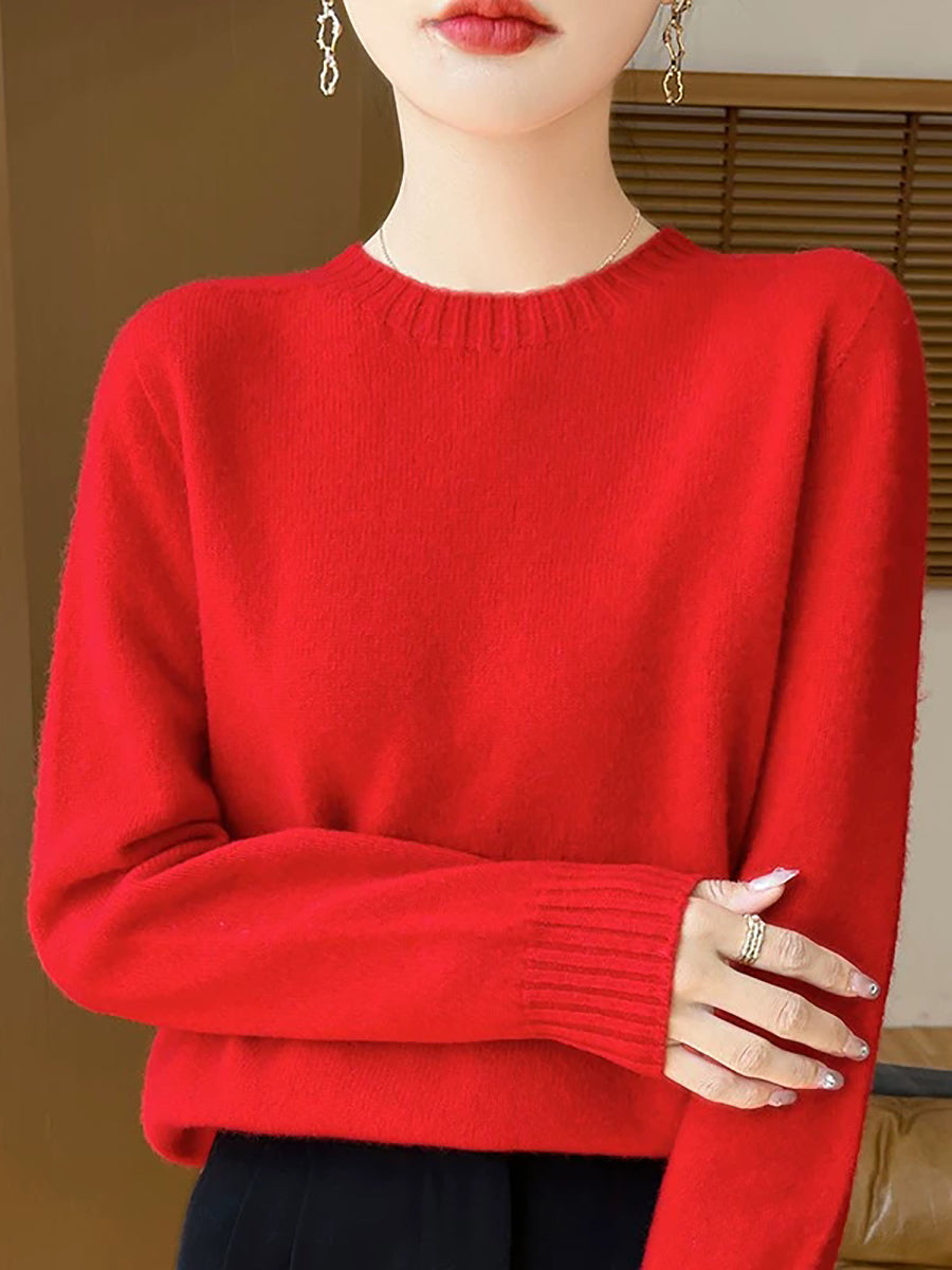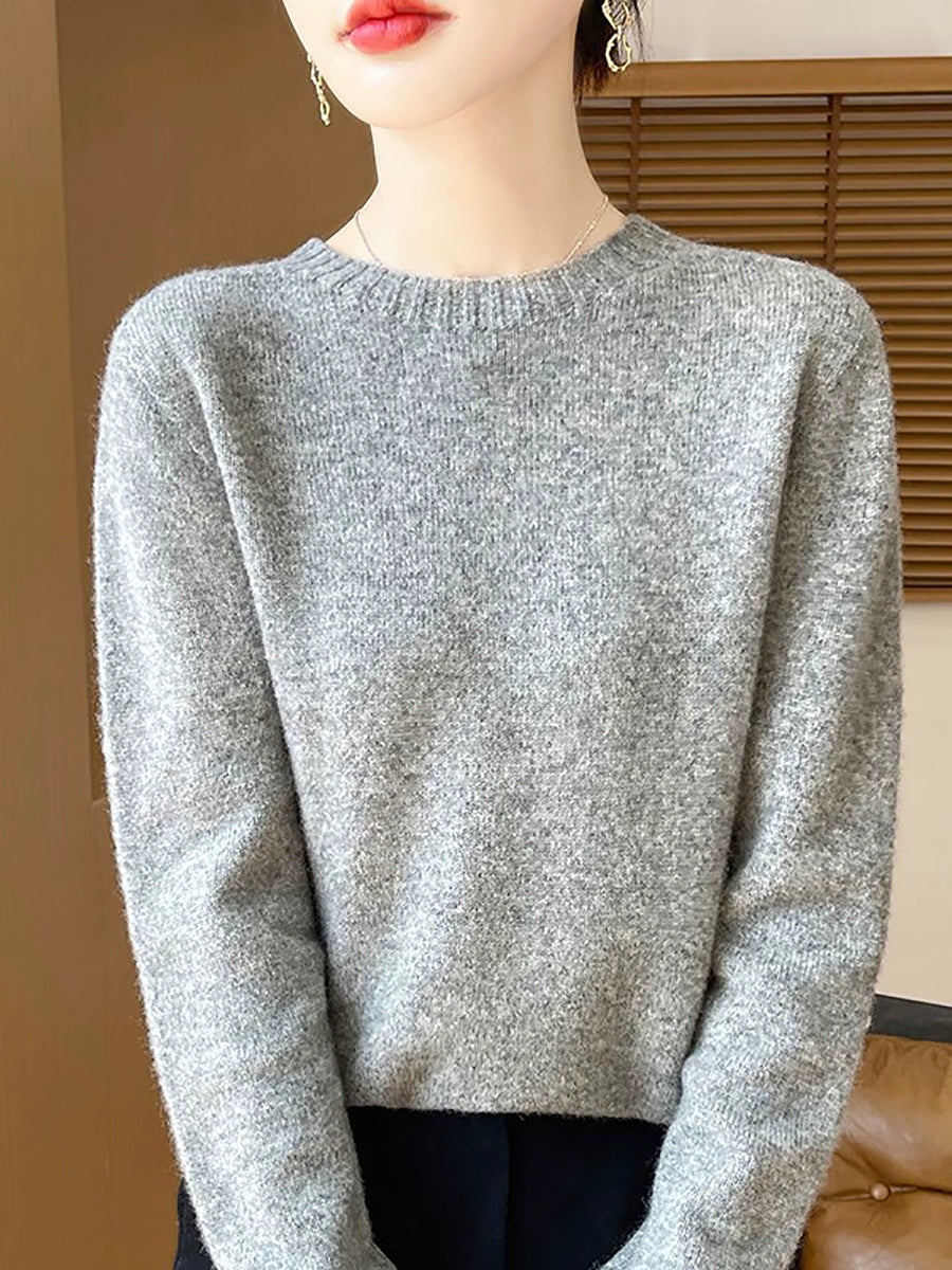 Women Spring Artsy Pure Color O-Neck Wool Sweater