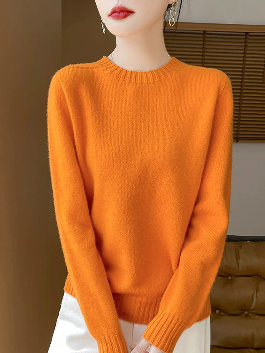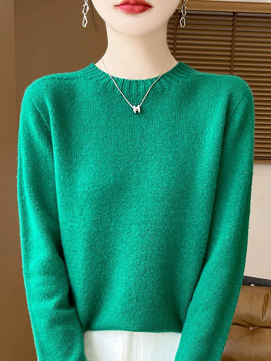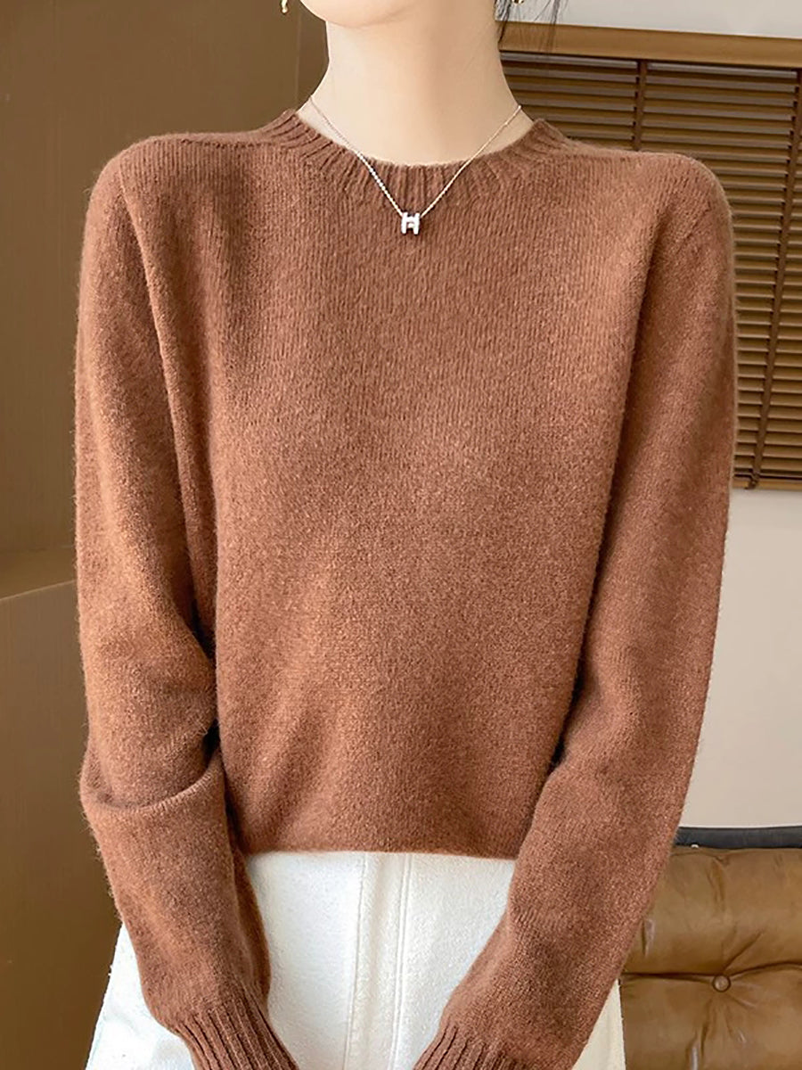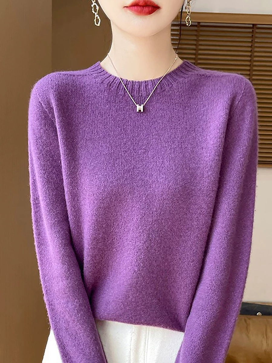 Women Spring Artsy Pure Color O-Neck Wool Sweater