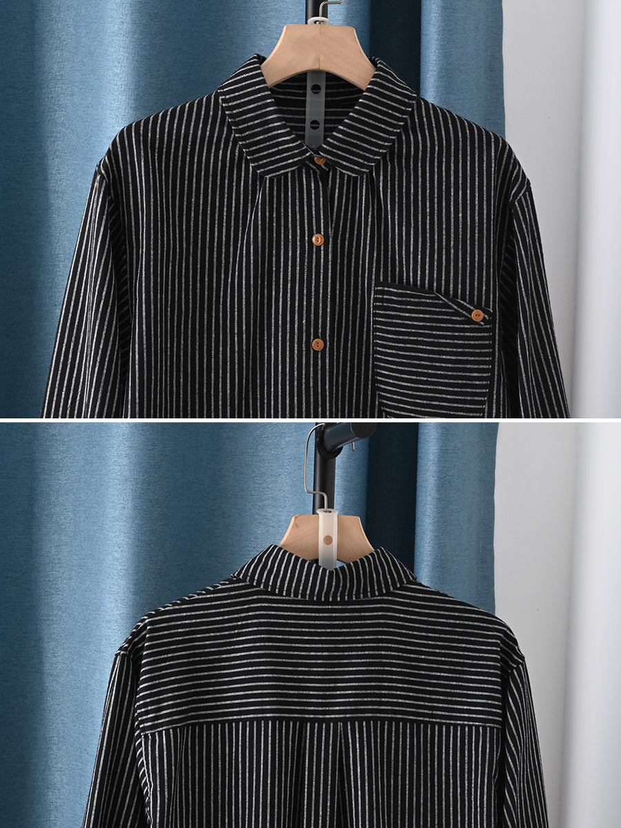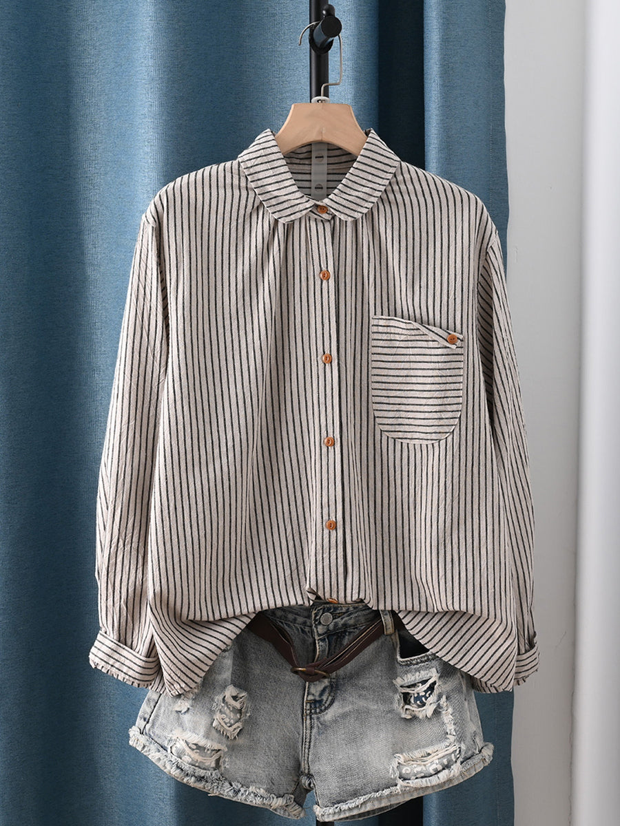 Women Spring Artsy Stripe Turn-down Collar 100%Cotton Shirt