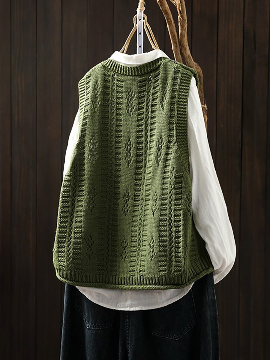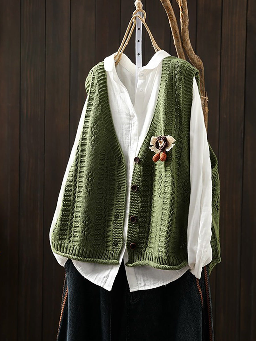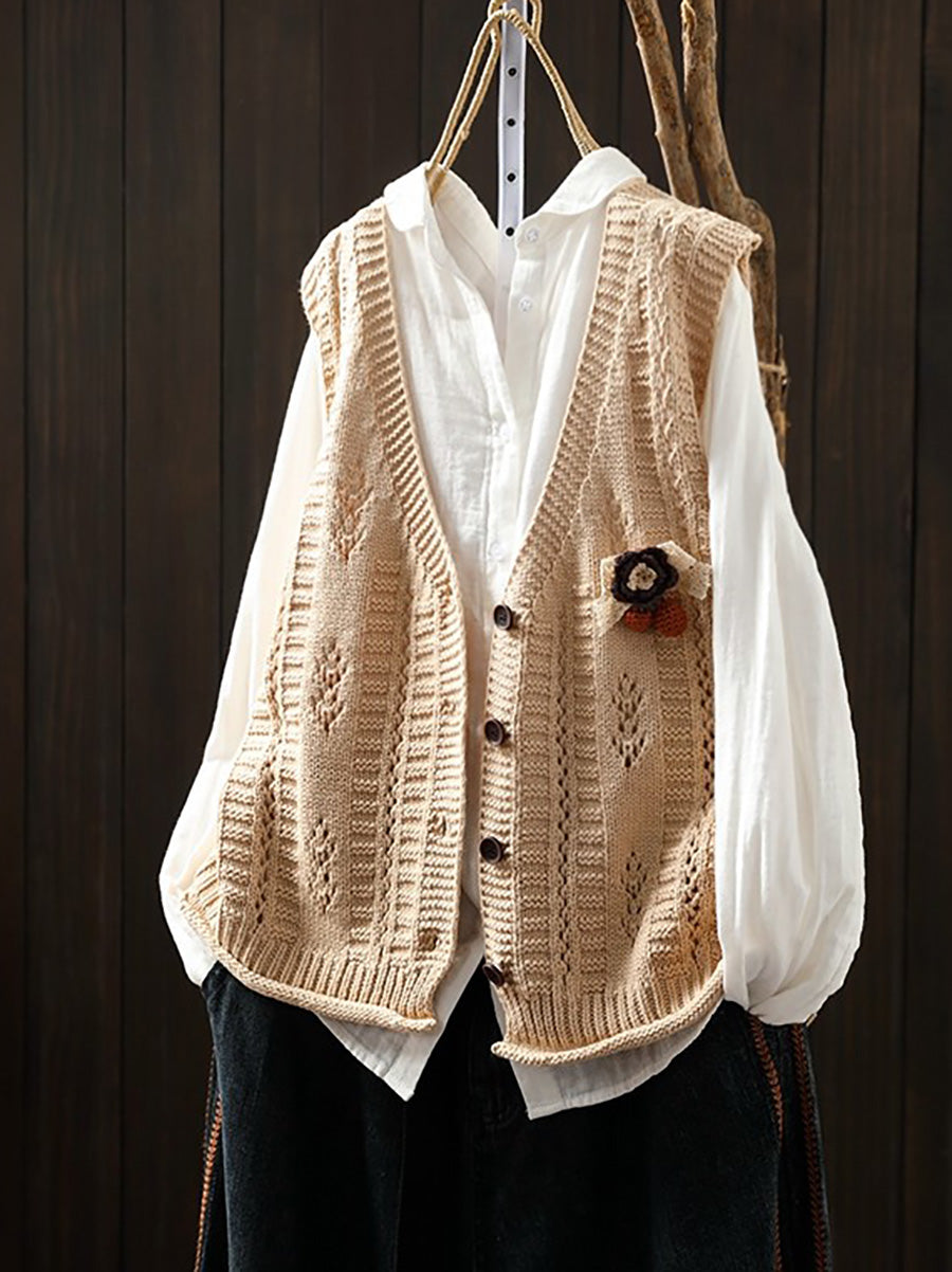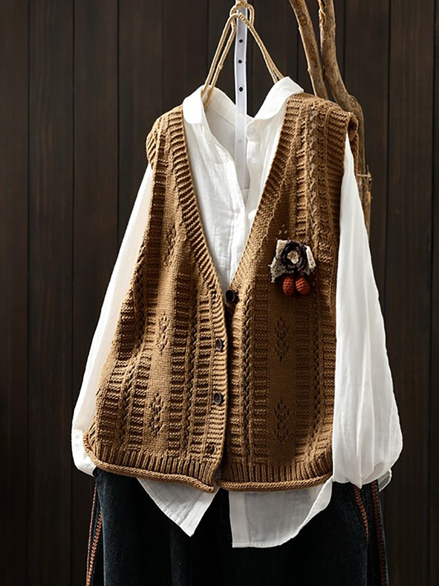 Crafted from a thoughtfully balanced blend of 45% cotton and 55% acrylic, this knitted vest delivers both comfort and durability. The distinctive V-neck silhouette pairs with an artsy aesthetic, making it an ideal layering piece for transitional seasons. Perfect for spring and autumn wear, this versatile garment bridges casual and refined styling with understated sophistication.