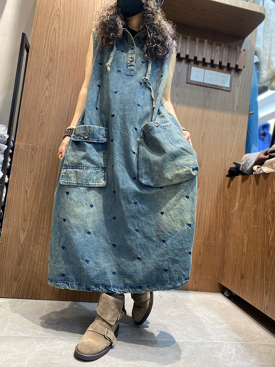 Women Spring Heart Embroidery Denim Hooded Vest Dress