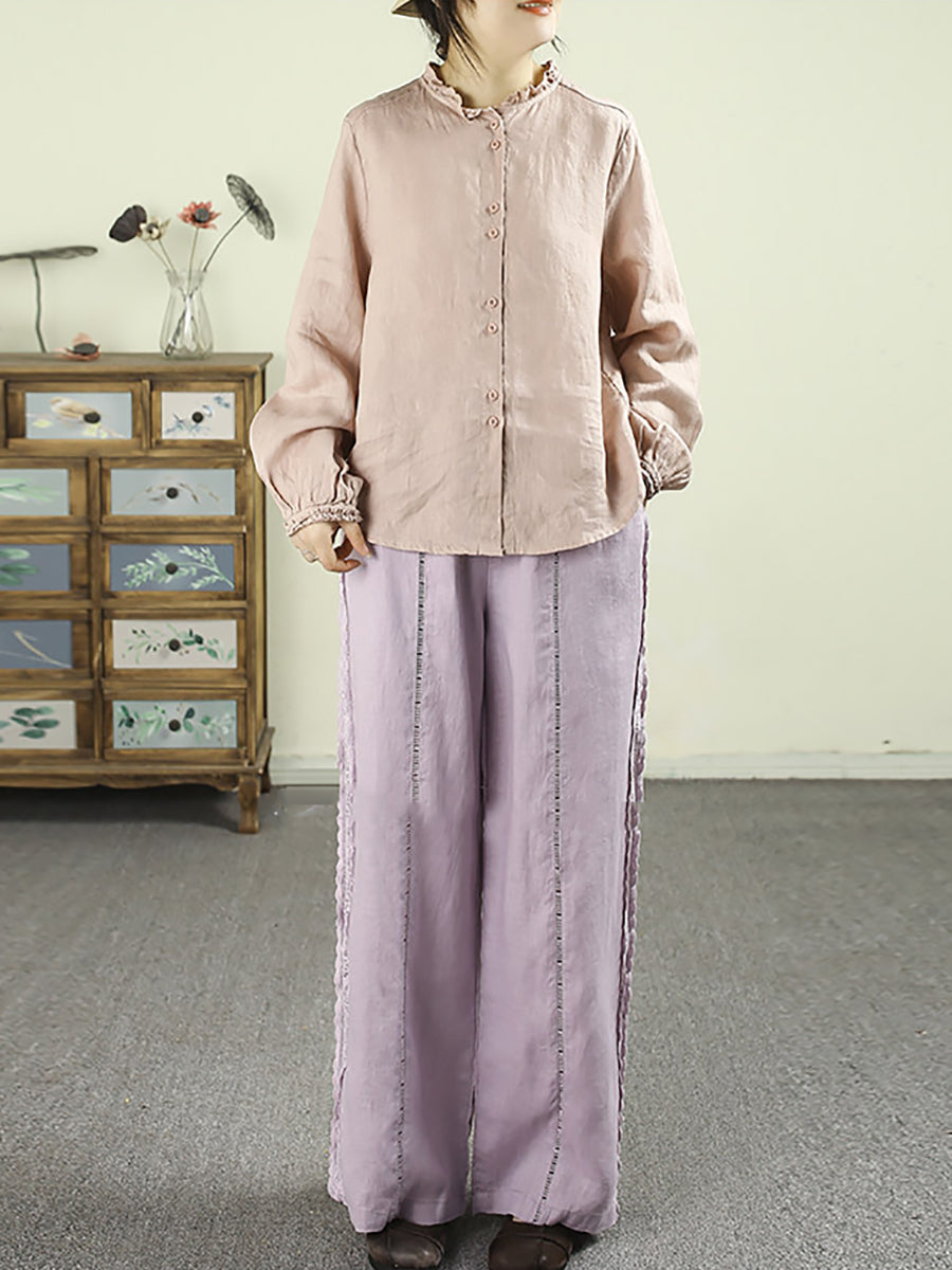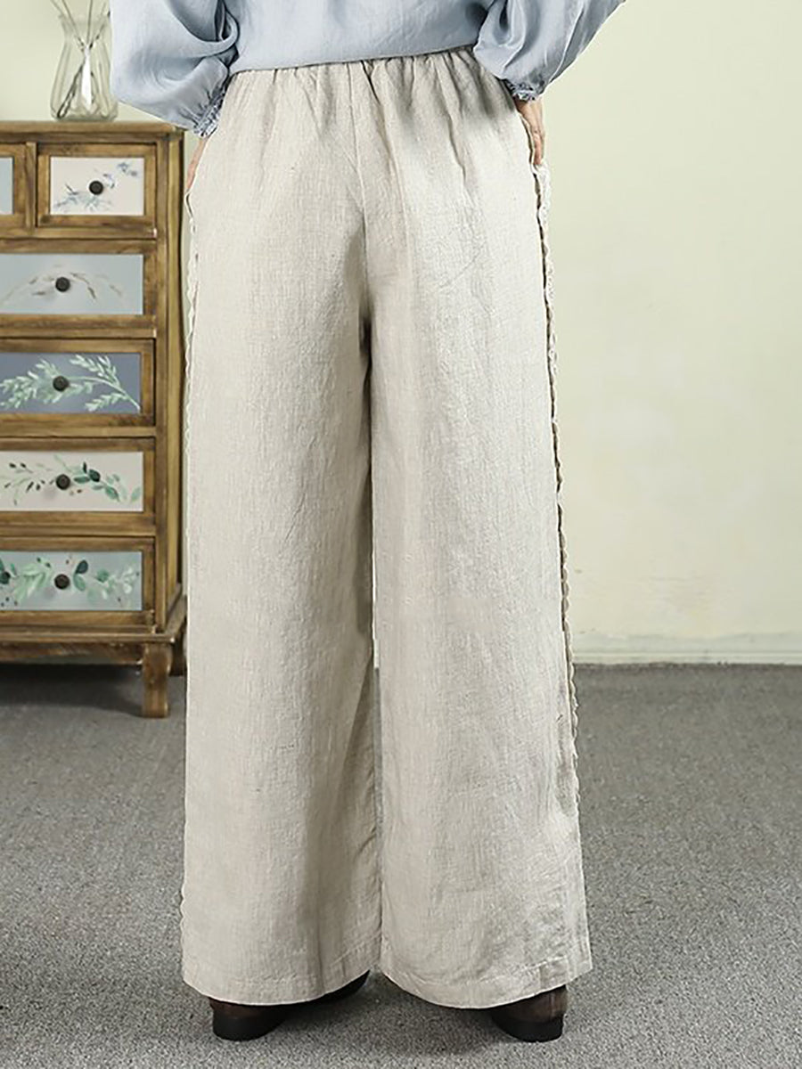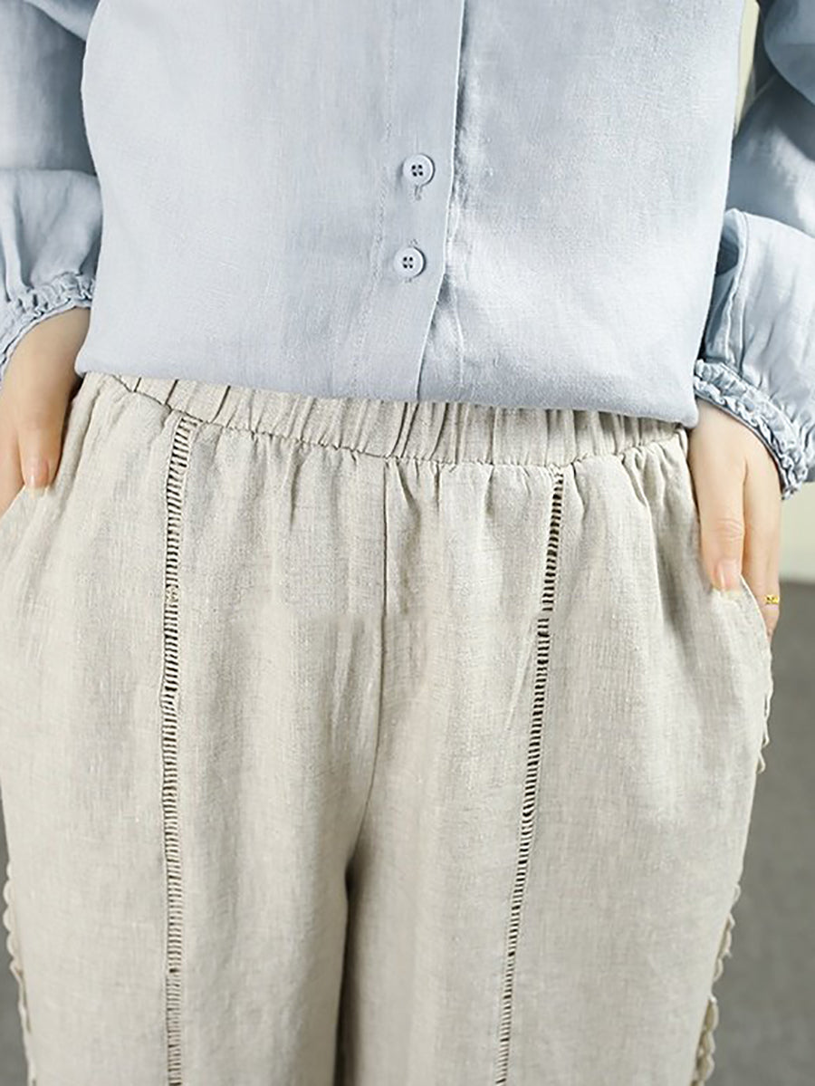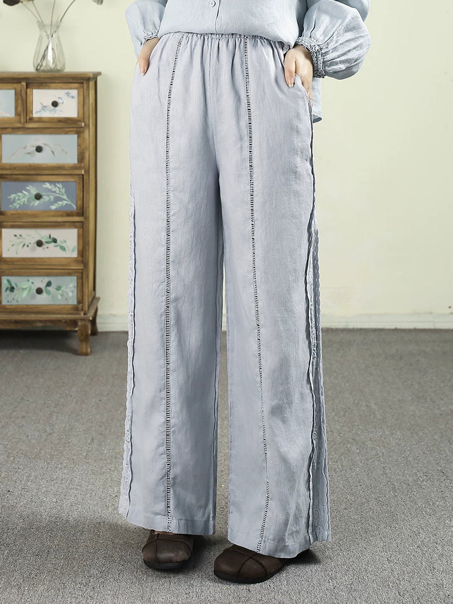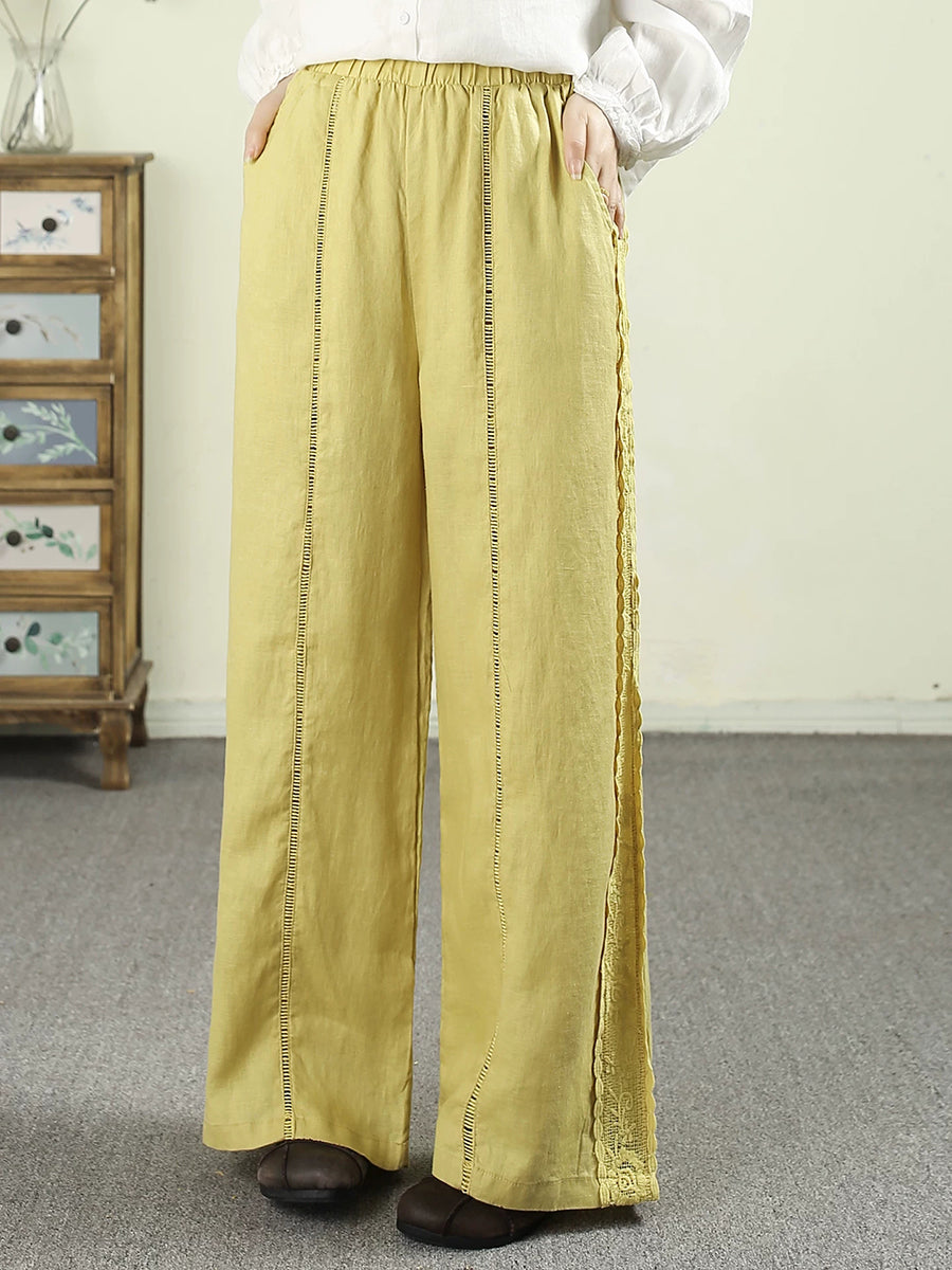 Women Spring Pure Color Lace 100%Linen Straight Pants