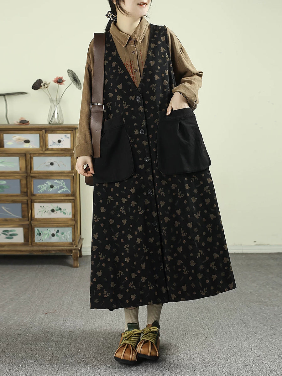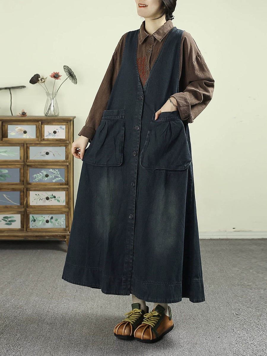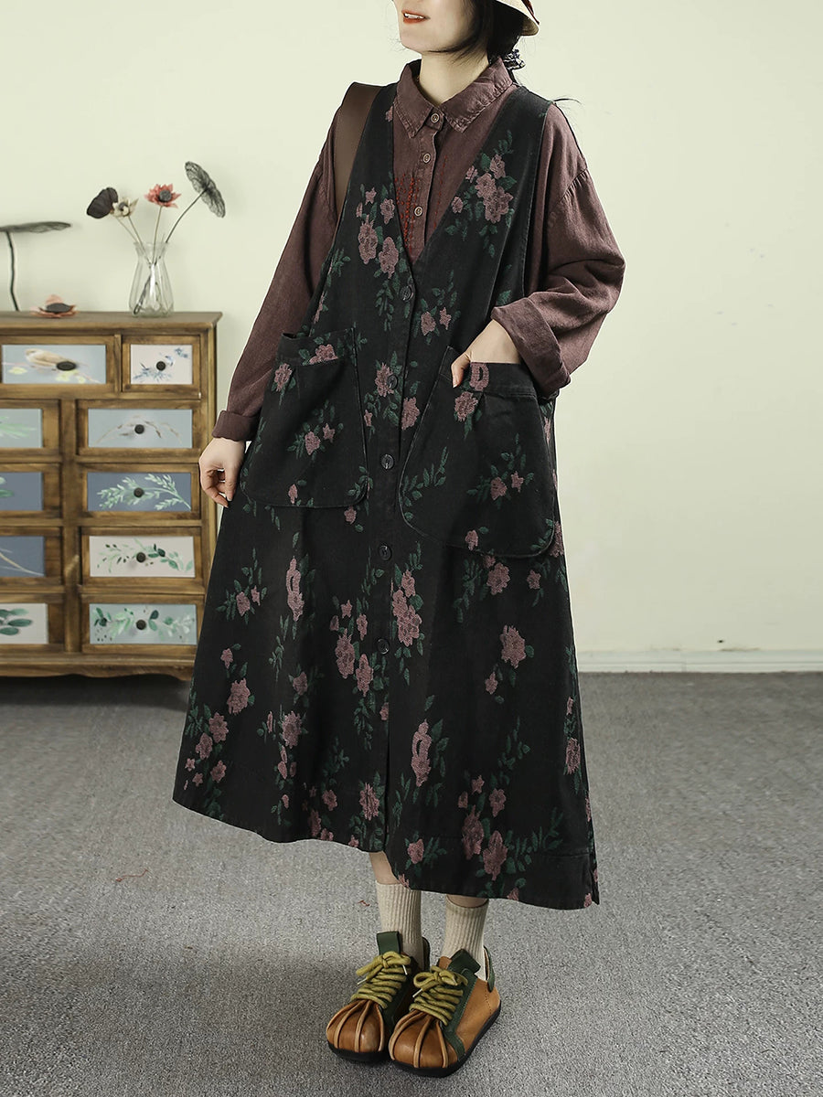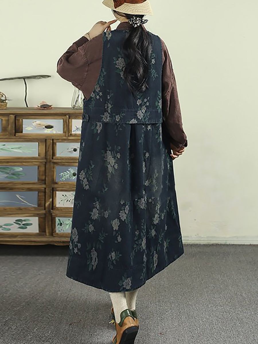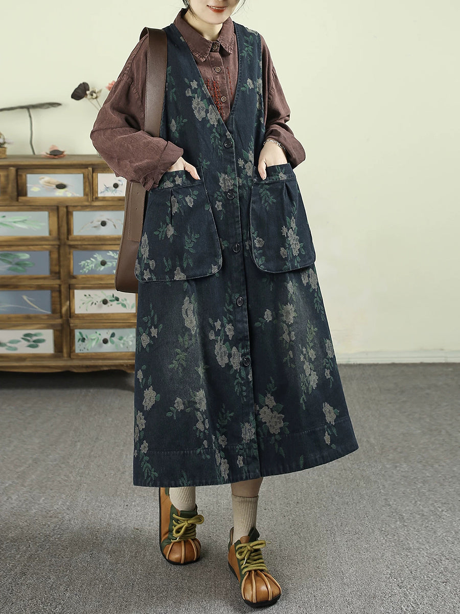 Women Spring Retro Floral Denim V-Neck Vest Dress