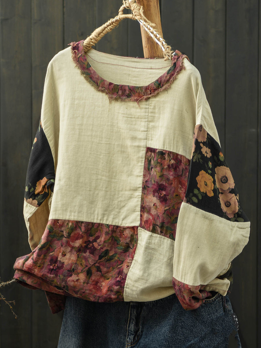 Women Spring Retro Floral Patch Cotton Shirt