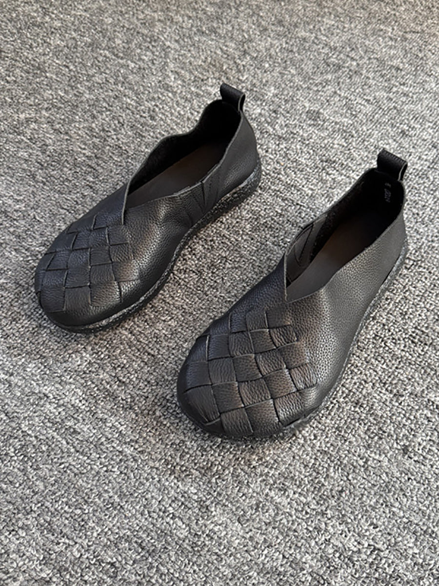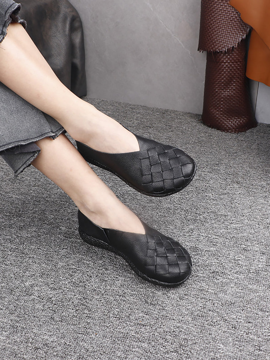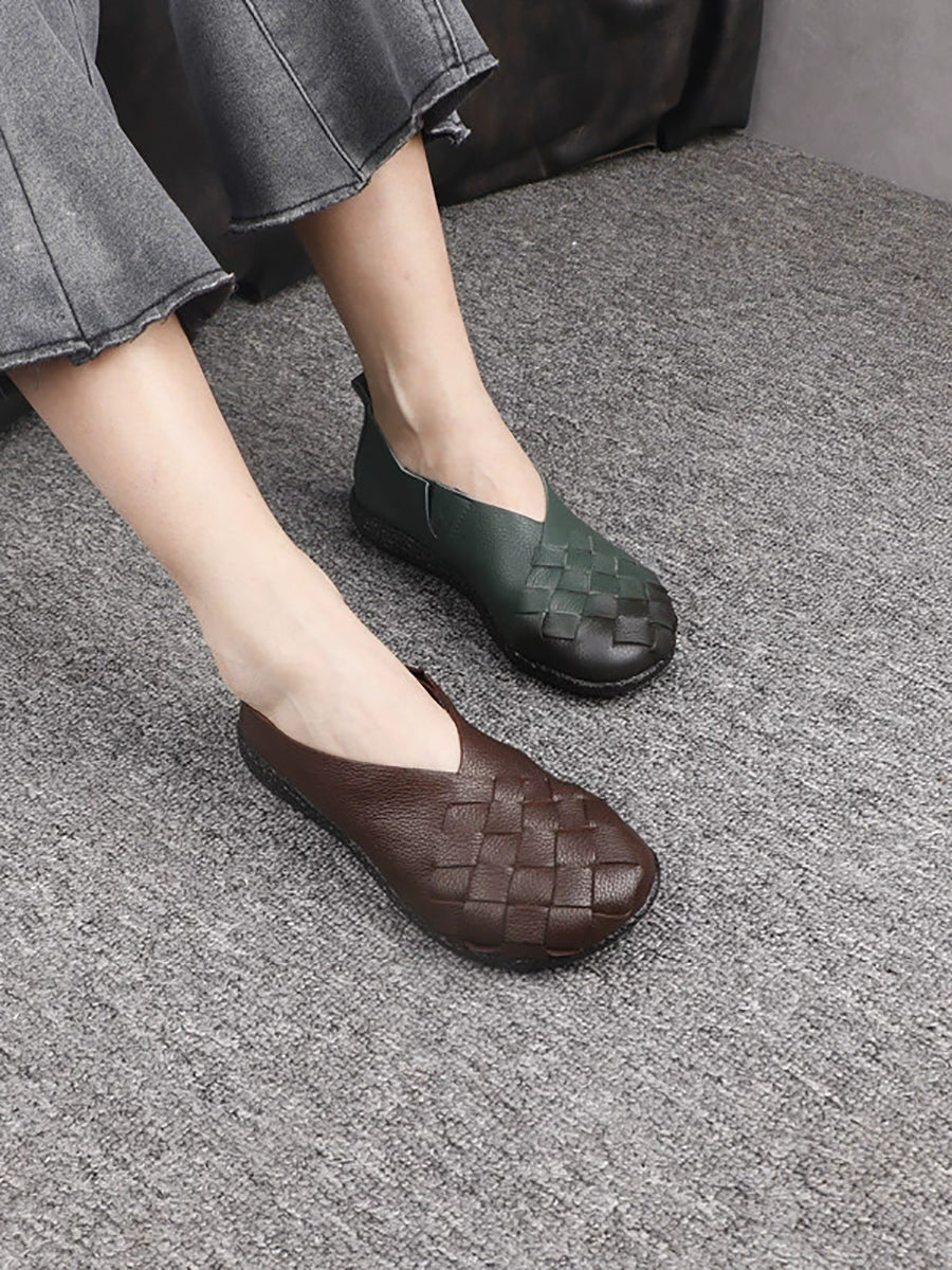 Women Spring Retro Genuine Leather Weave Flat Shoes