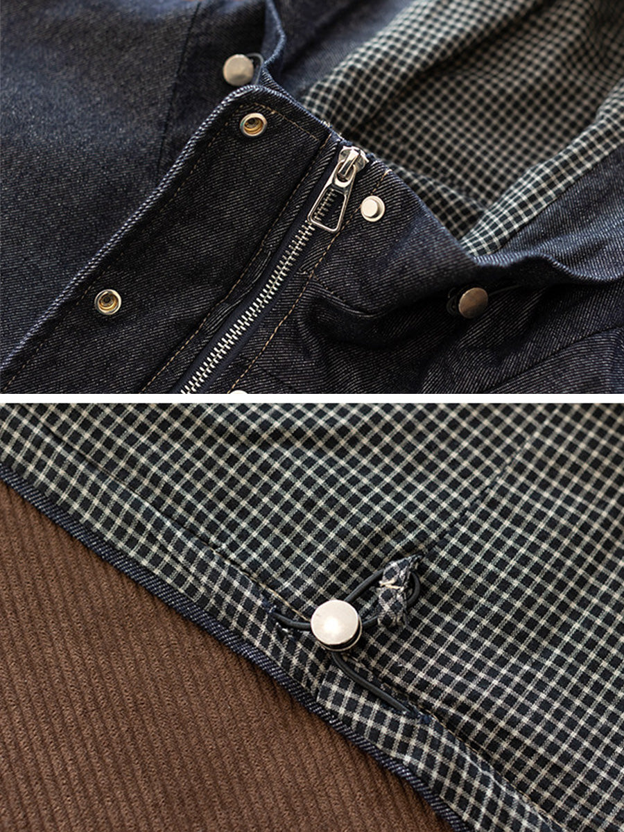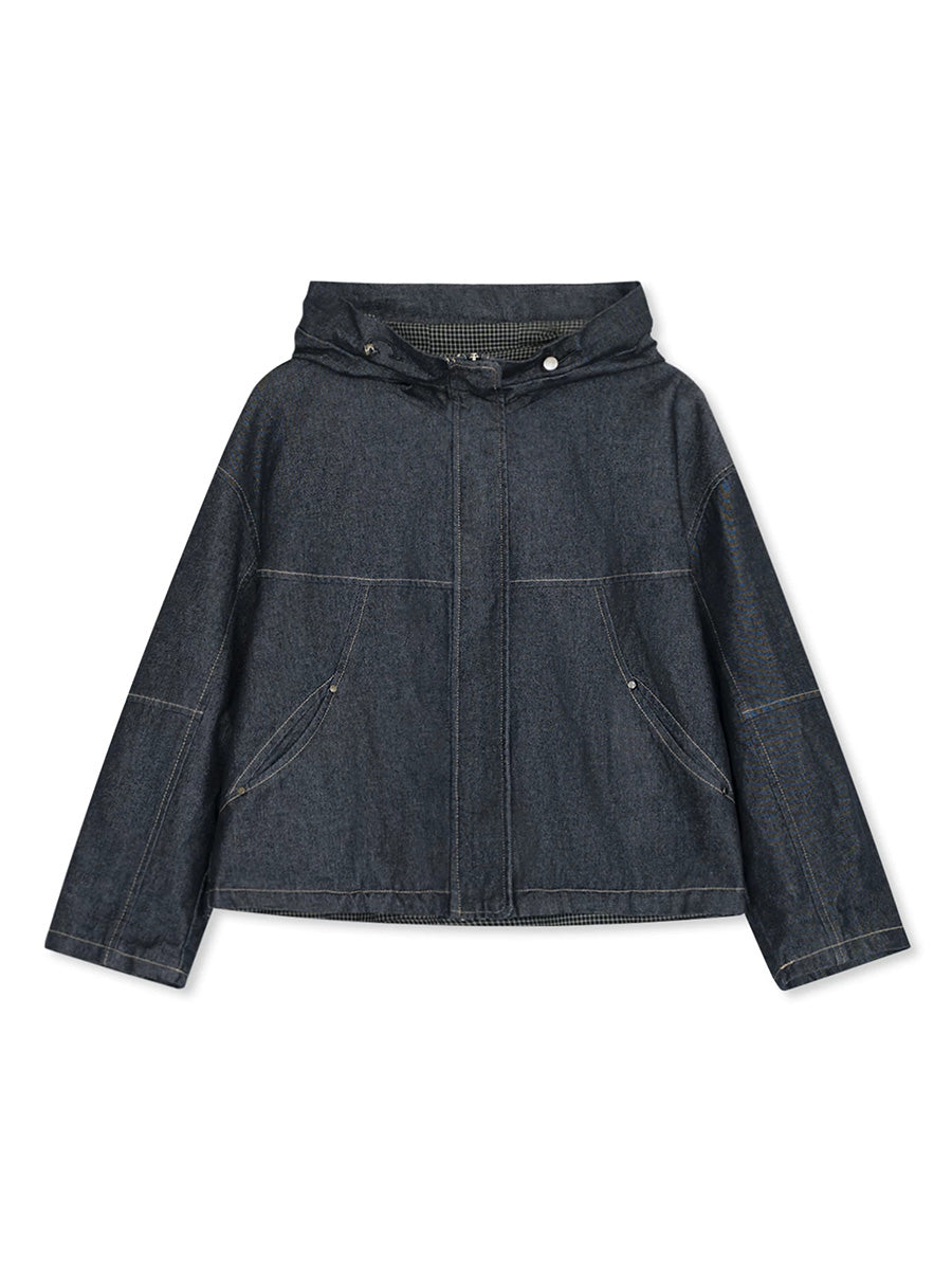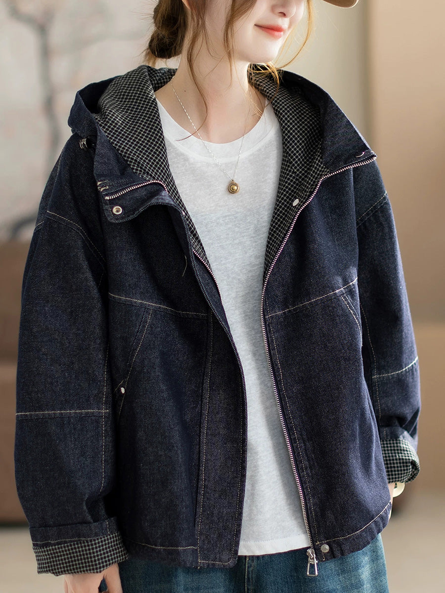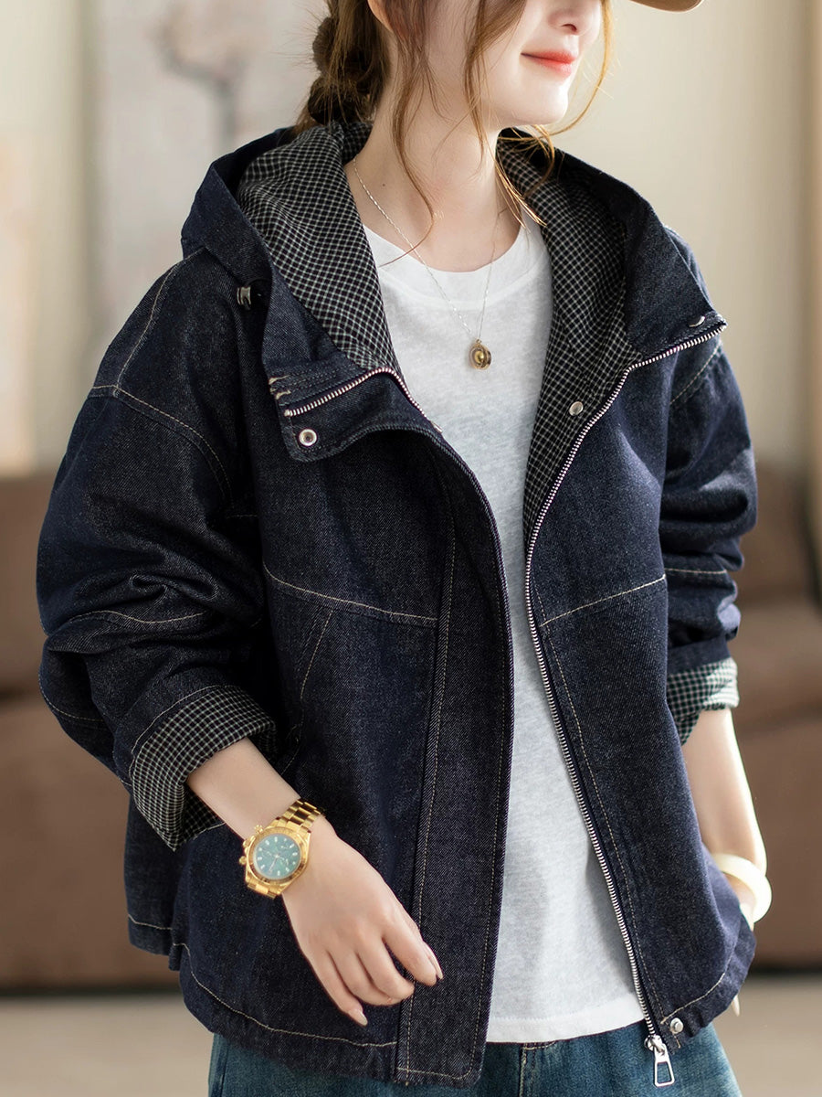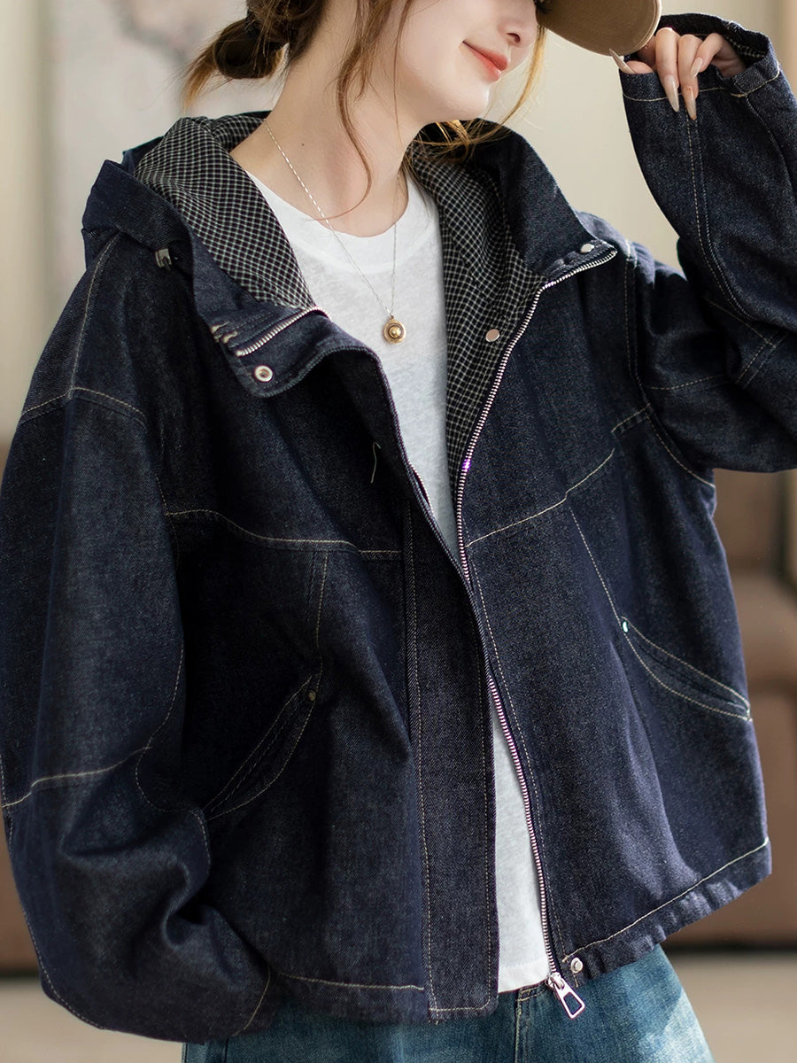 Women Spring Retro Pure Color Denim Hooded Coat