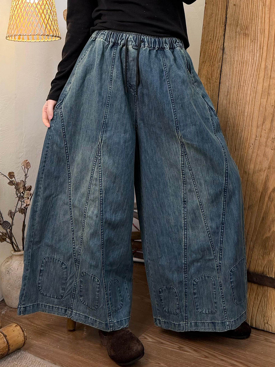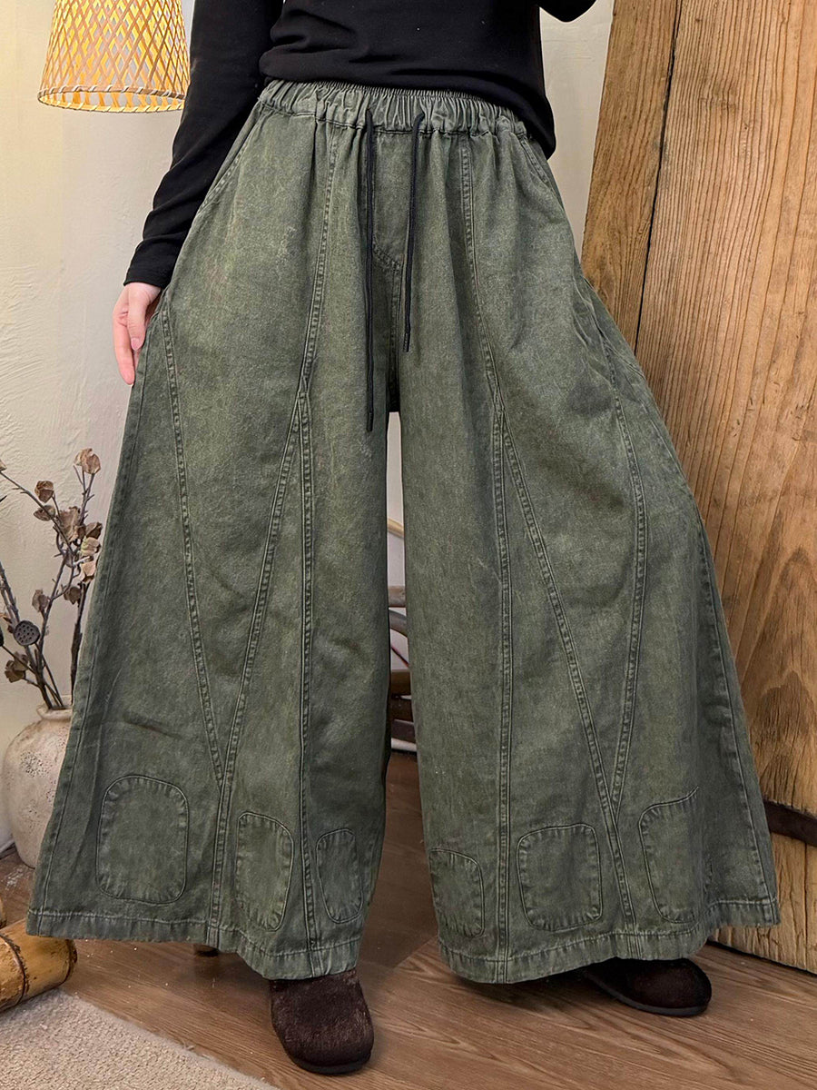 Women Spring Retro Pure Color Denim Wide-leg Pants