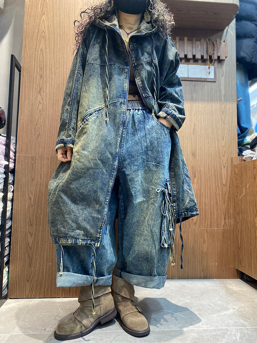 Women Spring Retro Pure Color Hooded Denim Coat