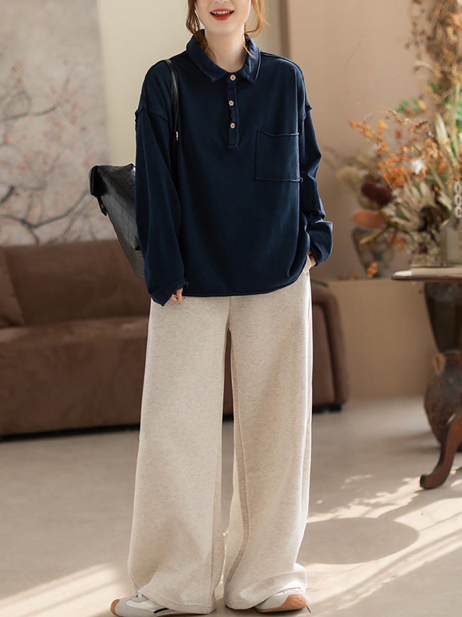 Women Spring Retro Pure Color Turn-down Collar Blouse