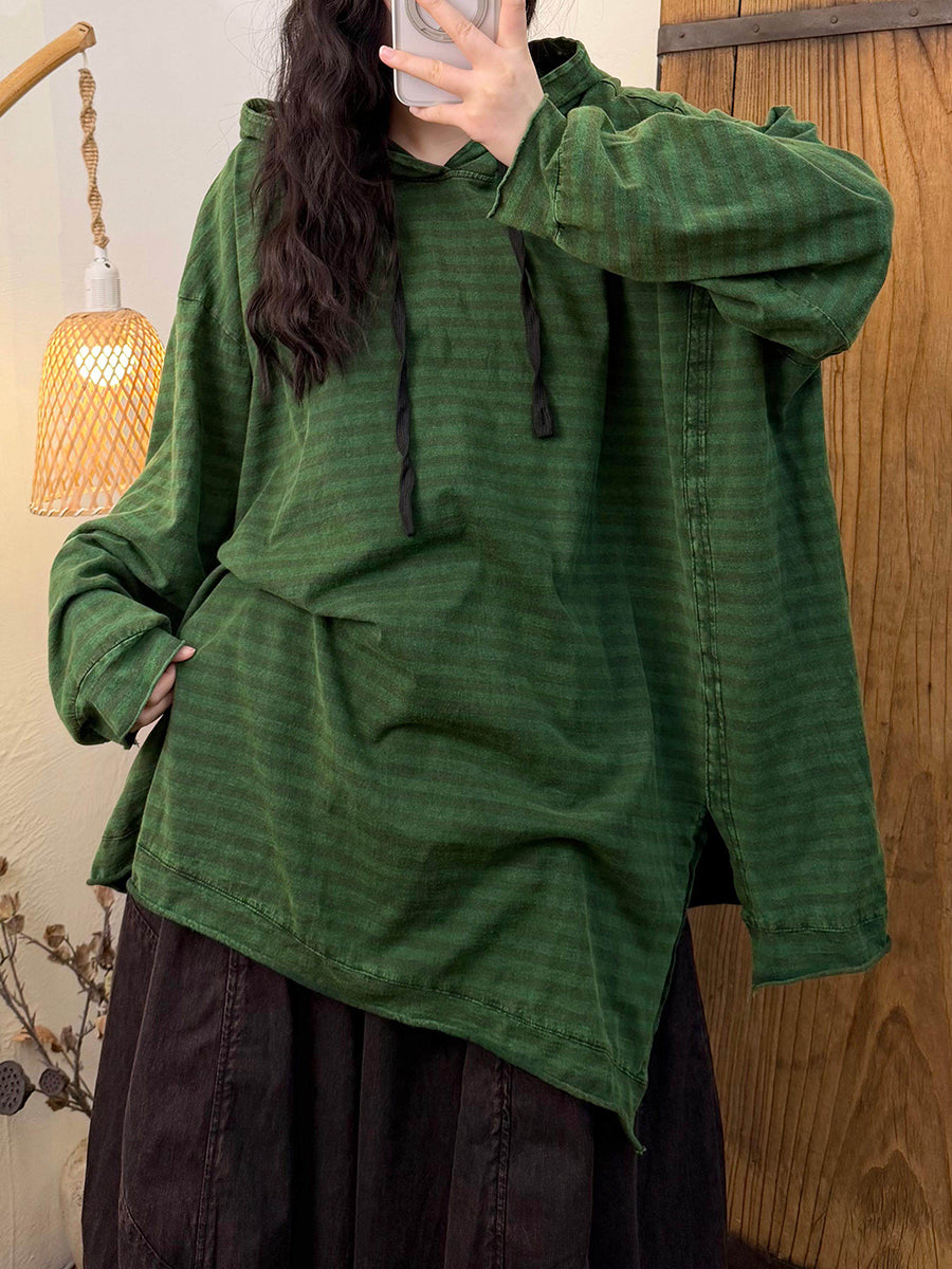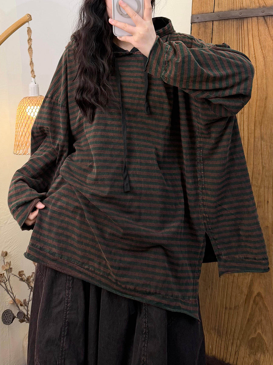 Women Spring Retro Stripe Cotton Hoodie