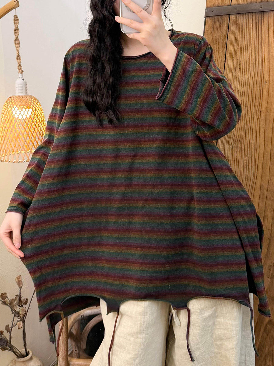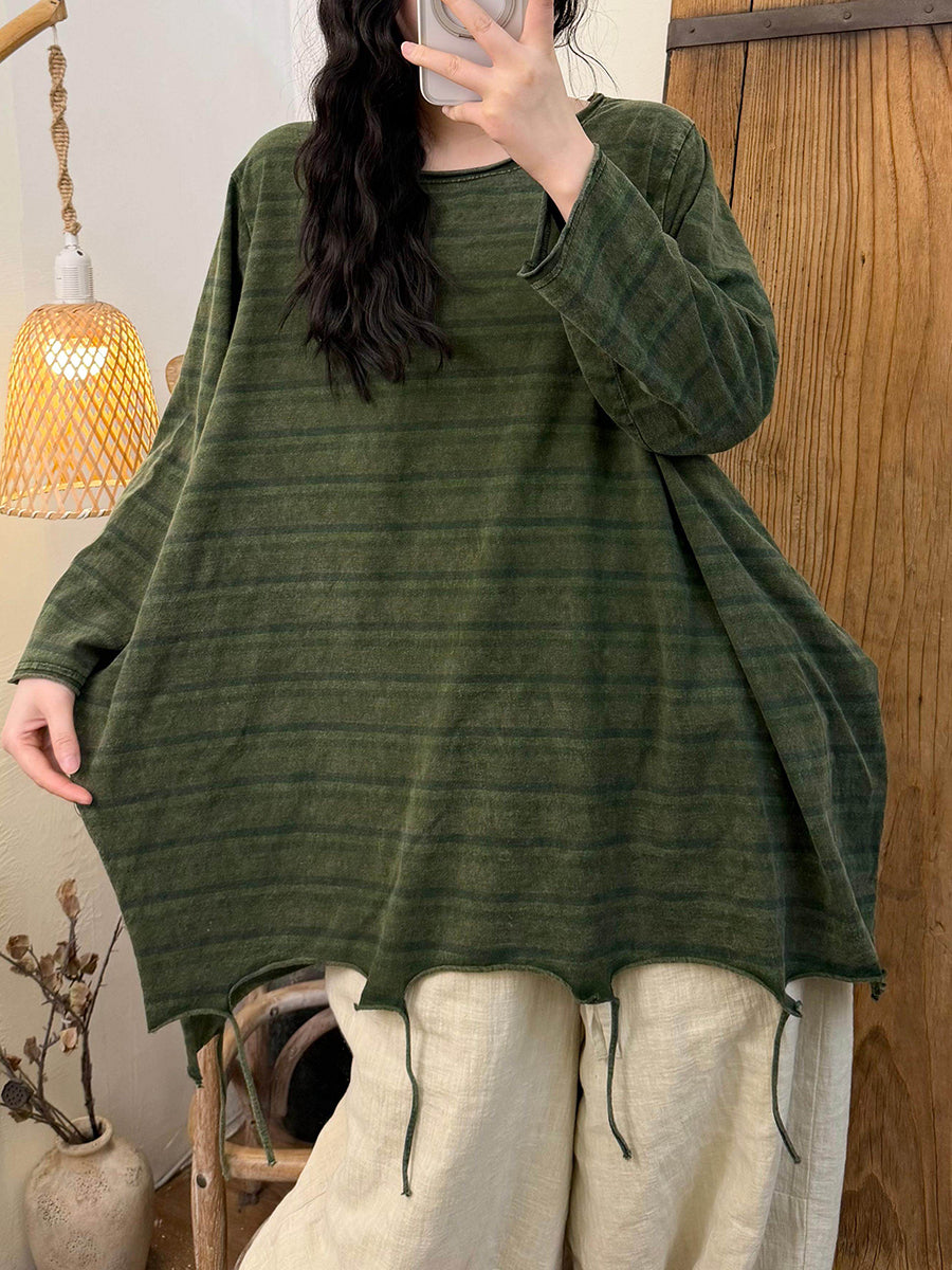 Women Spring Retro Stripe Cotton Tassel Hem O-Neck Blouse