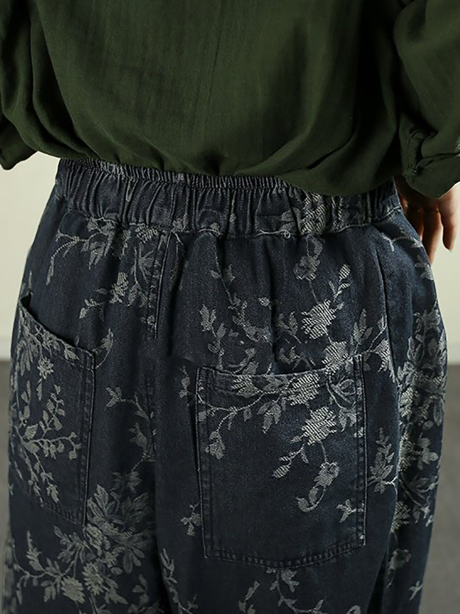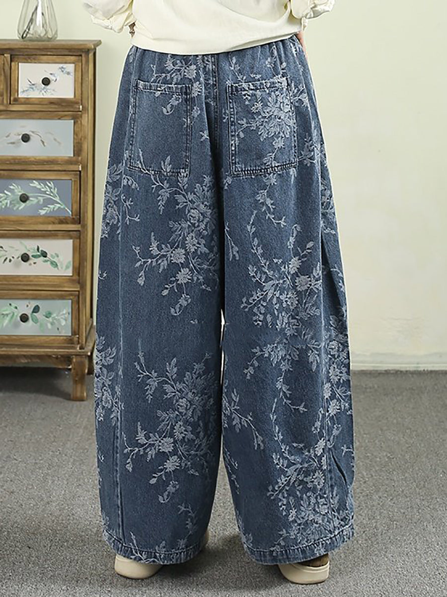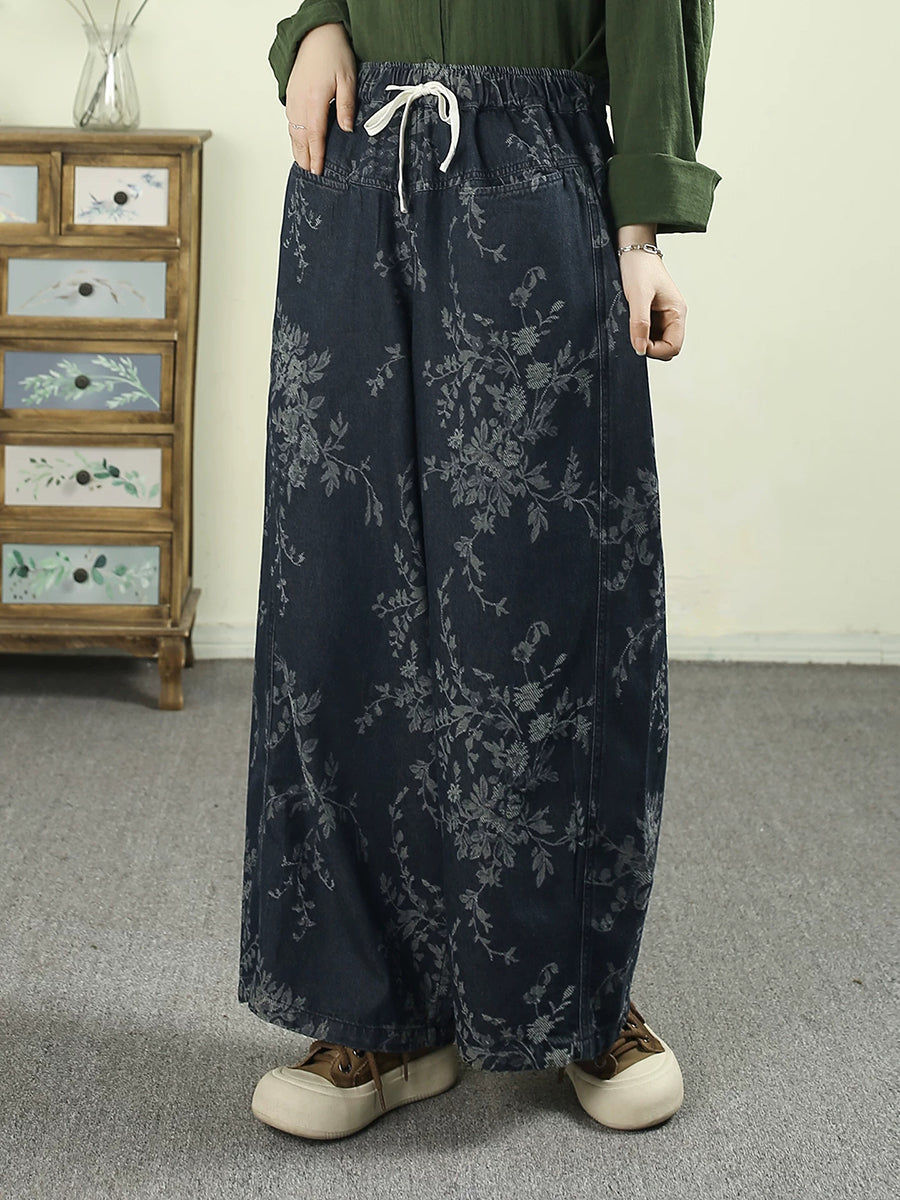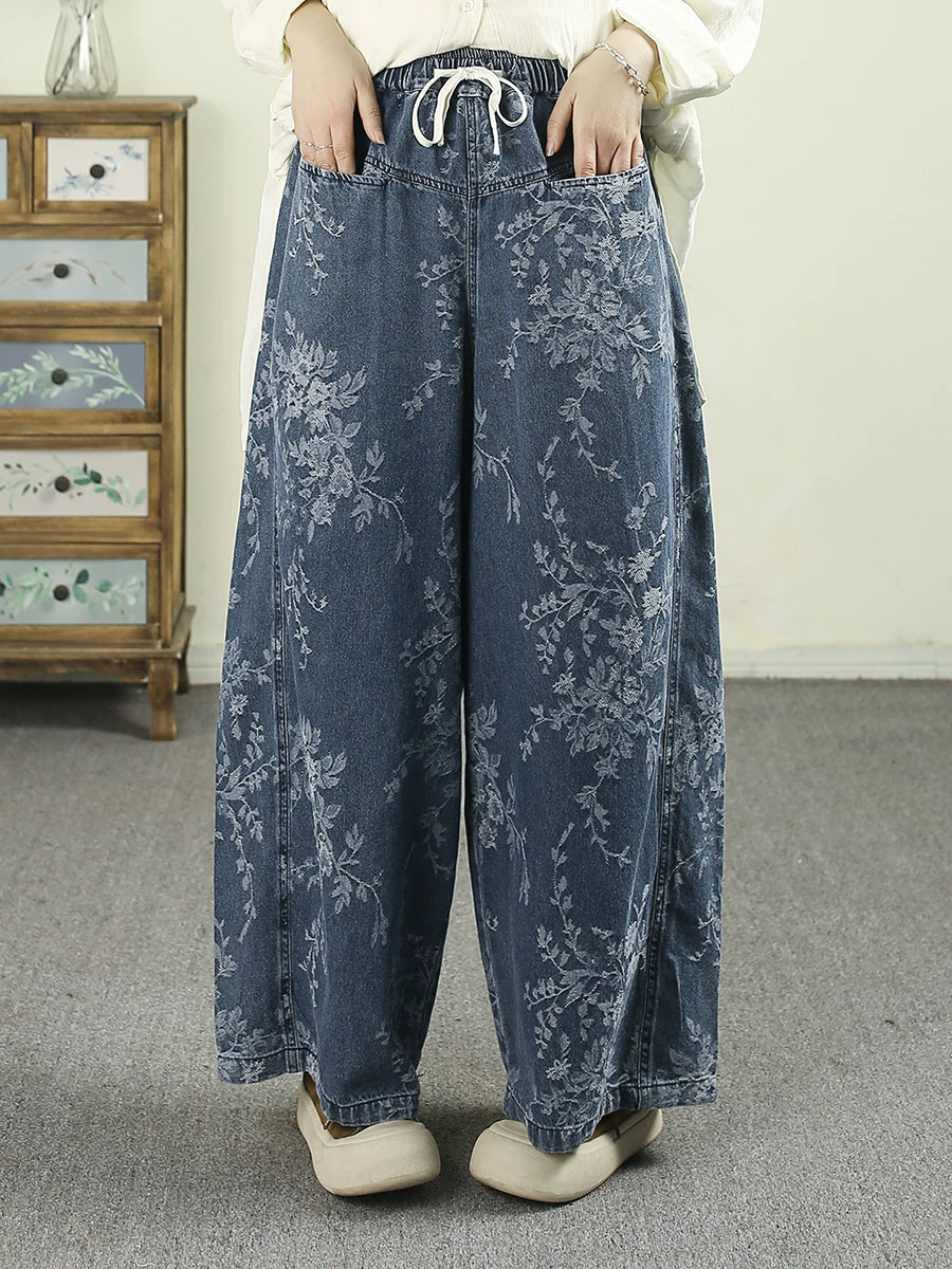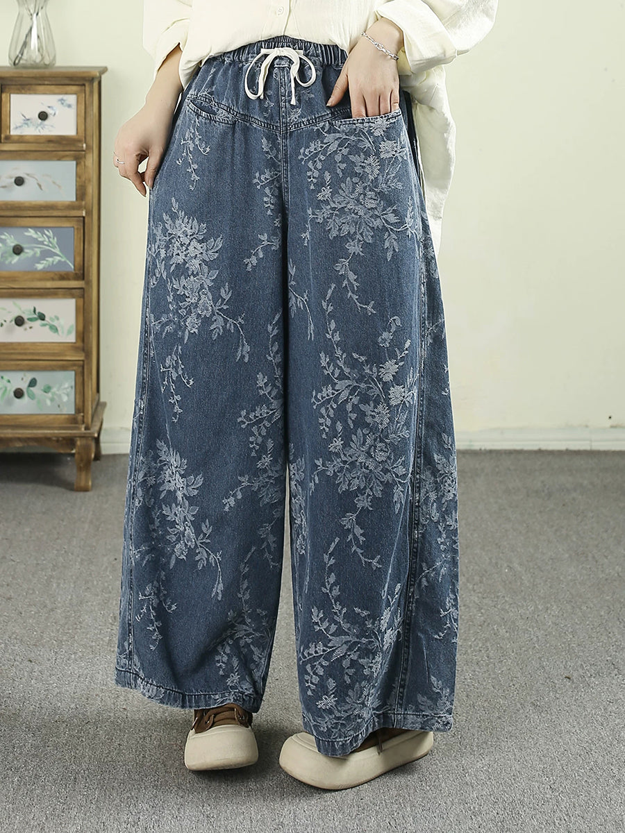 Women Spring Vintage Flower Cotton Wide-leg Pants