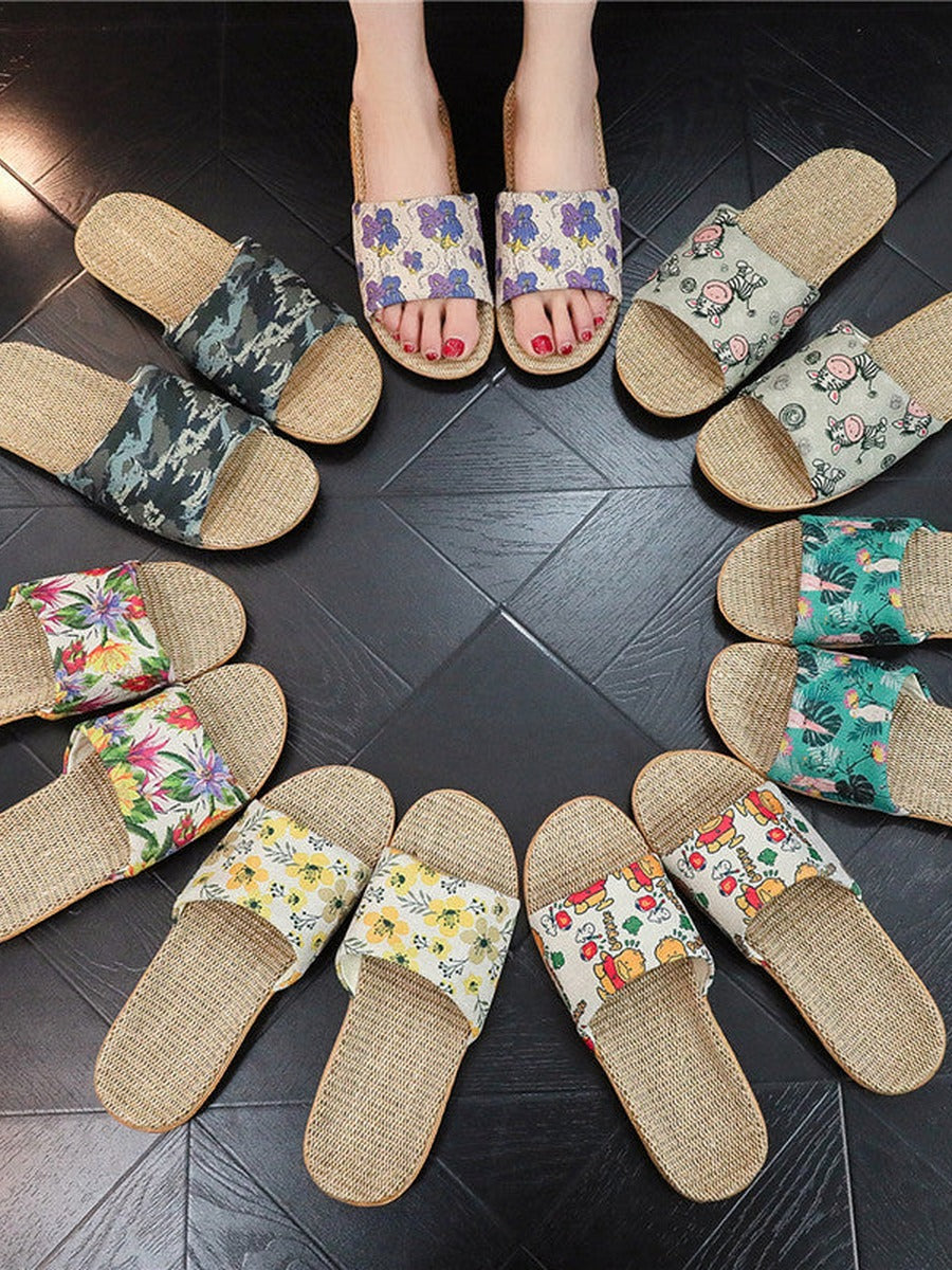 Women Summer Floral Printed Linen Thick Sole Slippers