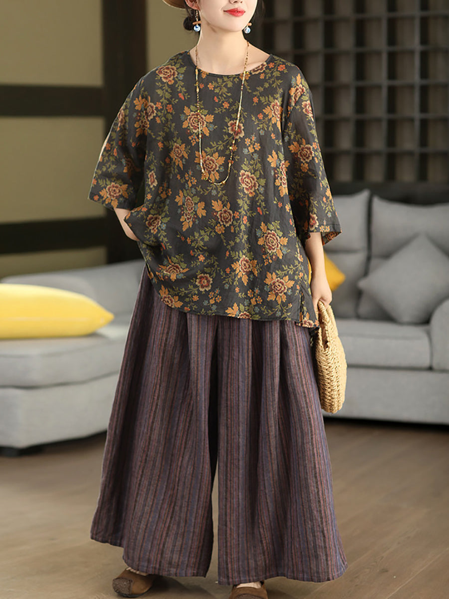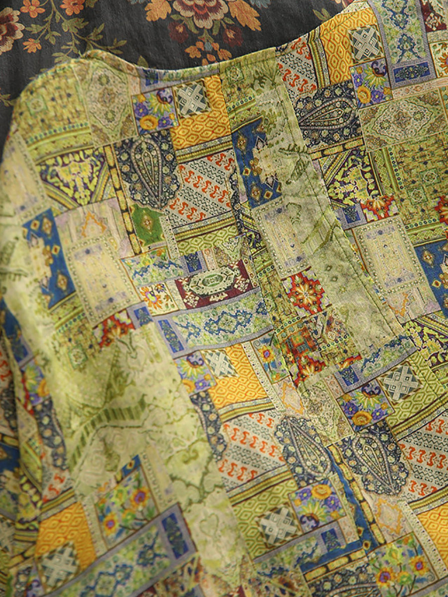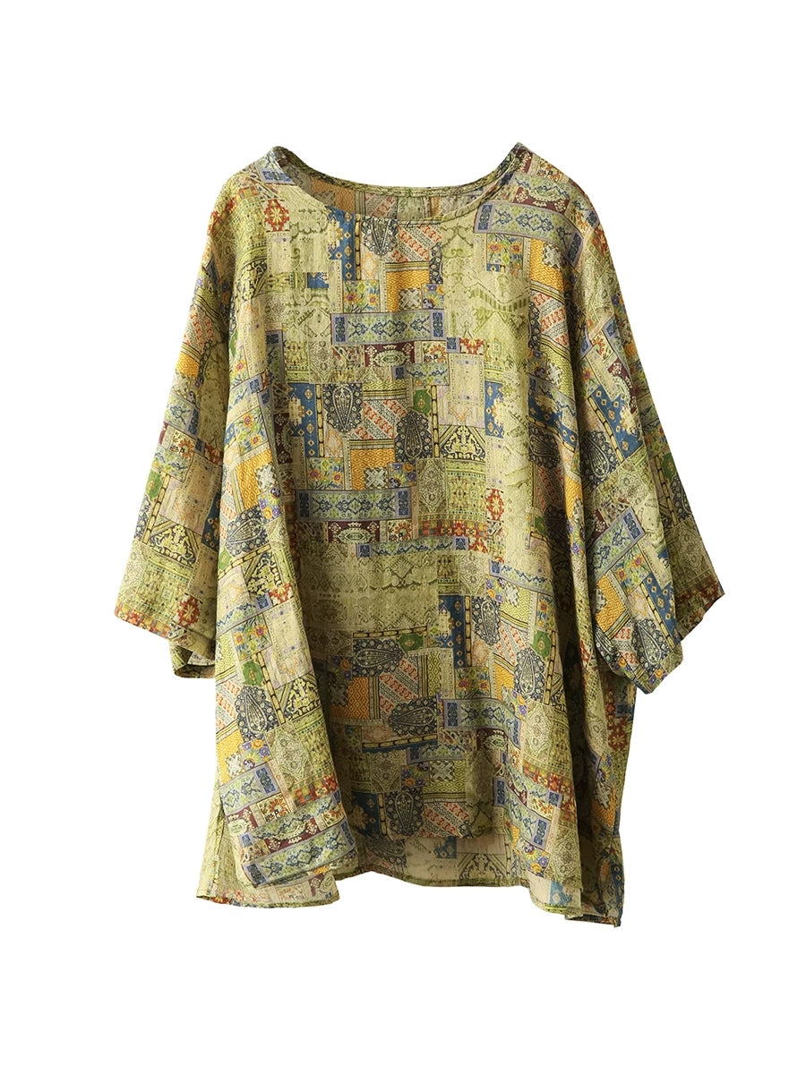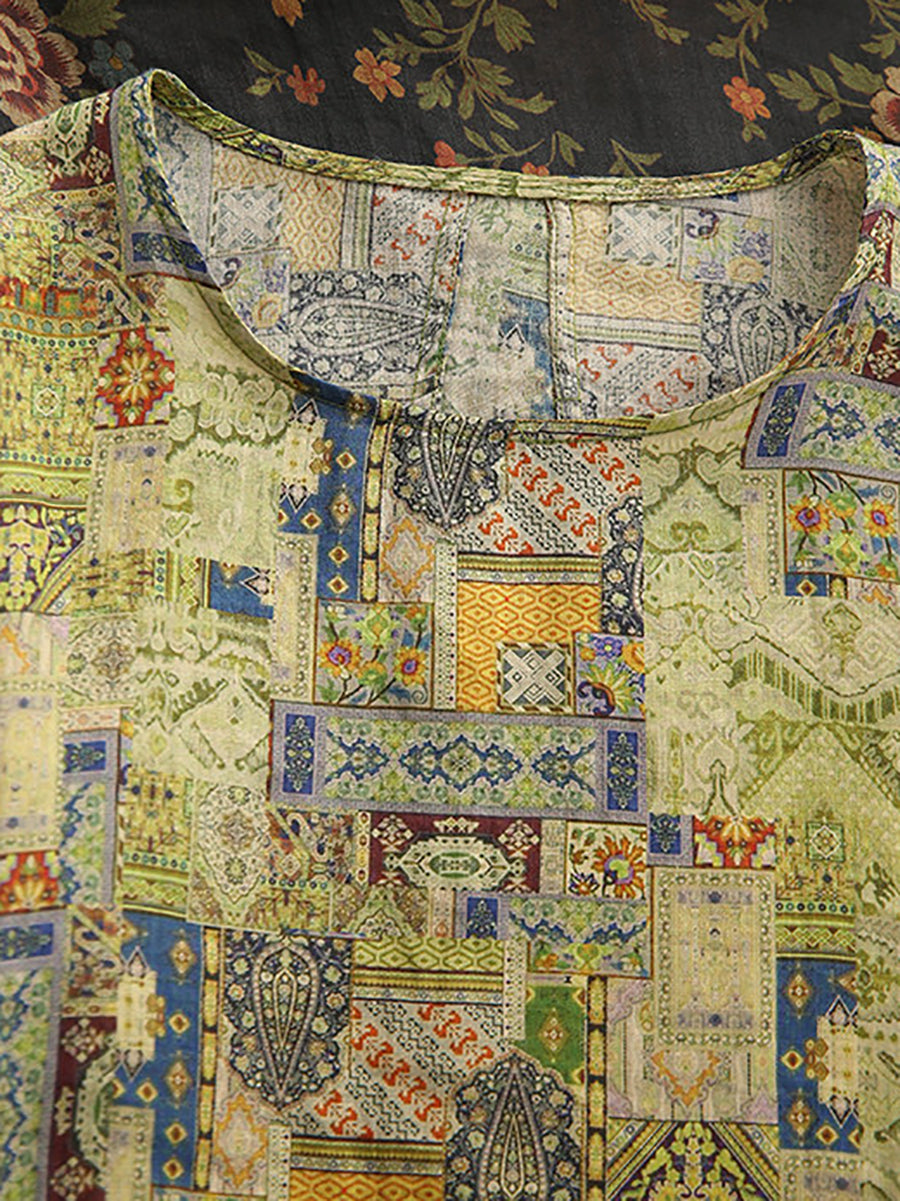 Women Summer Retro Patchwork O-Neck 100%Ramie Blouse