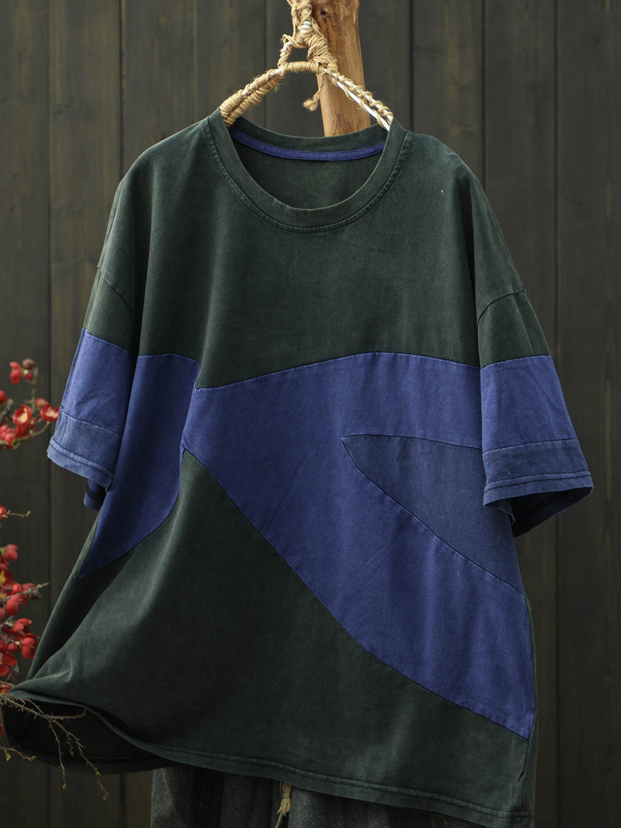Women Summer Retro Patchwork O-Neck Cotton T-Shirt