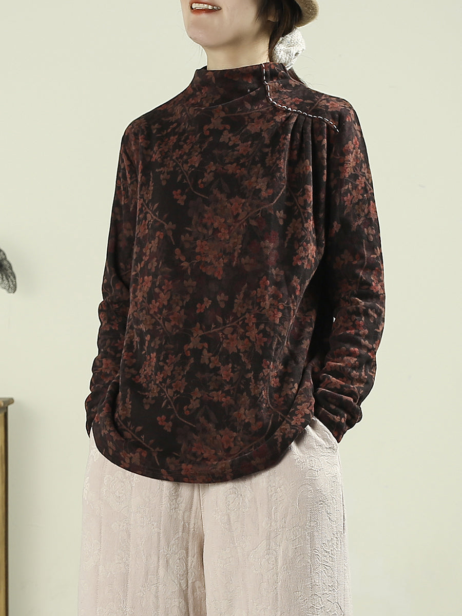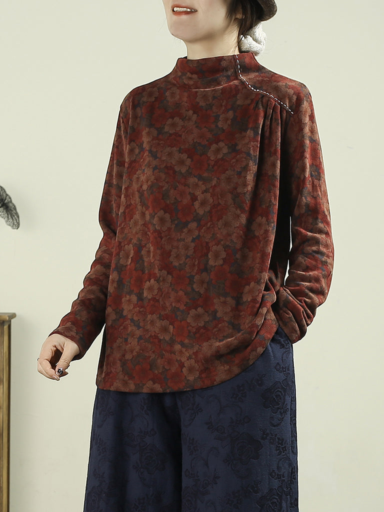 Women Vintage Autumn Flower Half-Turtleneck Blouse
