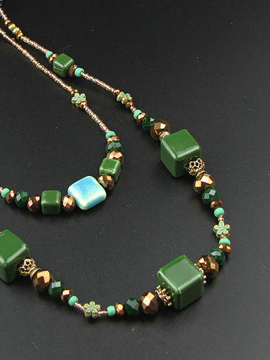 Women Vintage Dual-layer Green Ceramic Beads Necklace