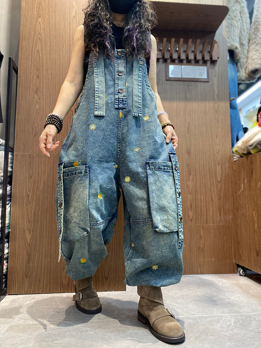 Women Vintage Embroidery Loose Denim Jumpsuits