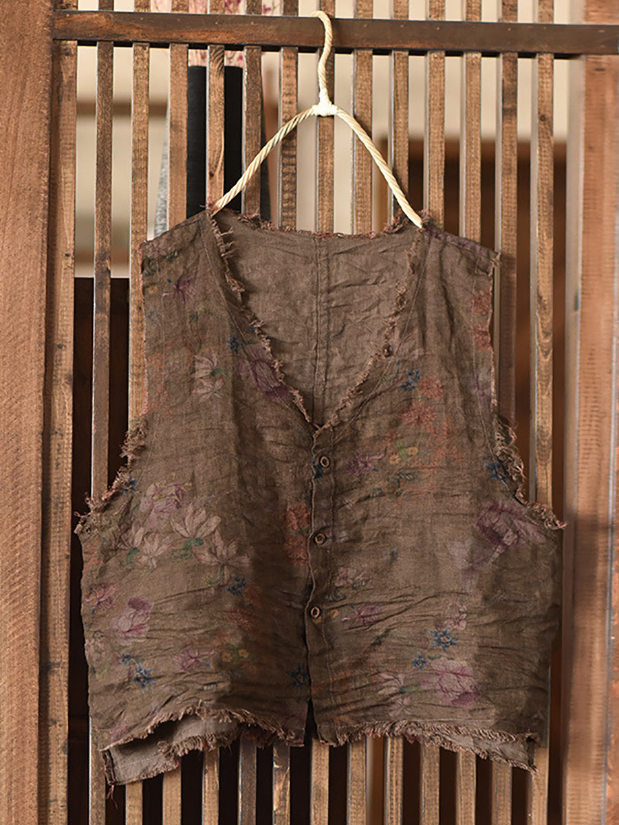 Women Vintage Floral Button-up Raw-edge Linen Vest