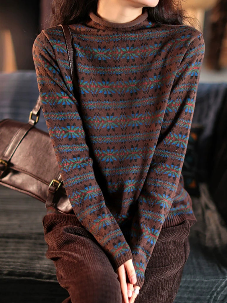 Plus Size Women Vintage Floral Turtleneck Warm Pullover Sweater