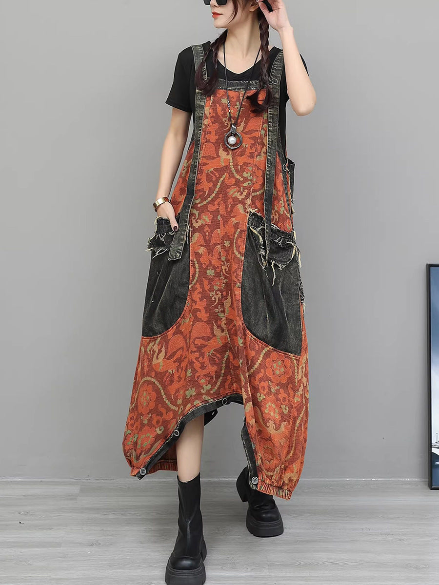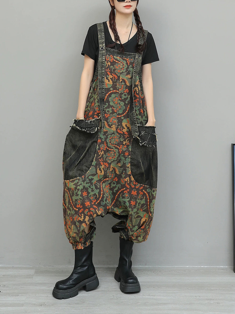 Women Vintage Flower Spliced Denim Jumpsuits