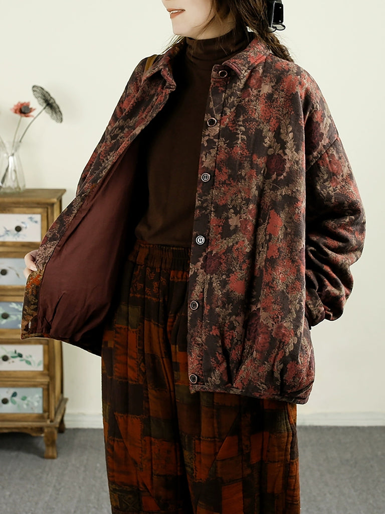 Women Vintage Flower Turn-down Collar 100%Cotton Padded Coat