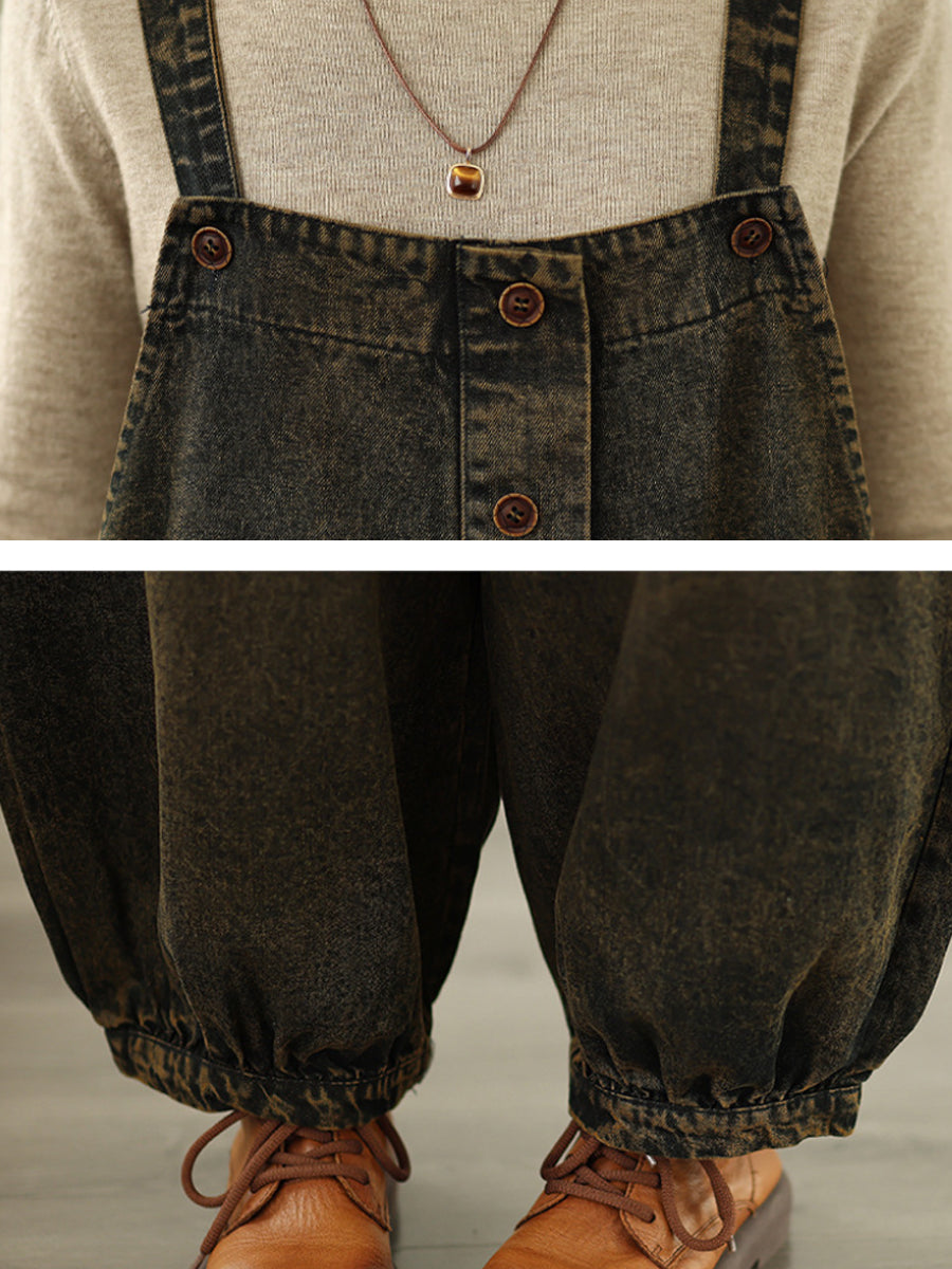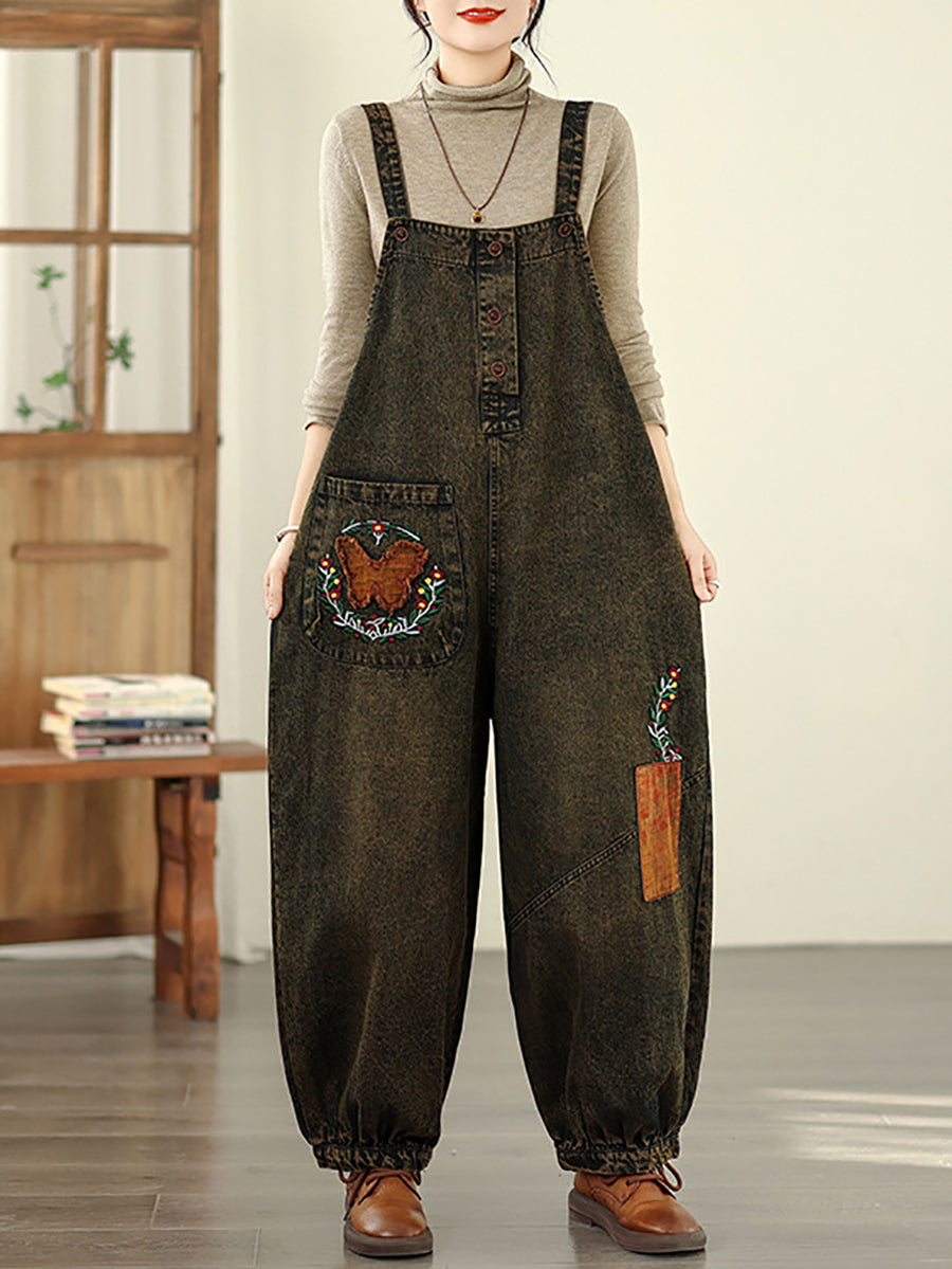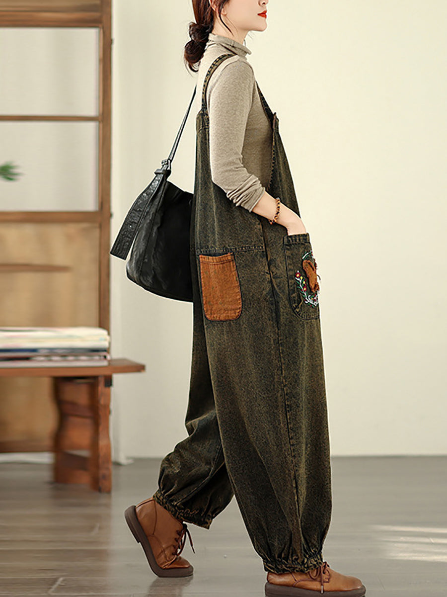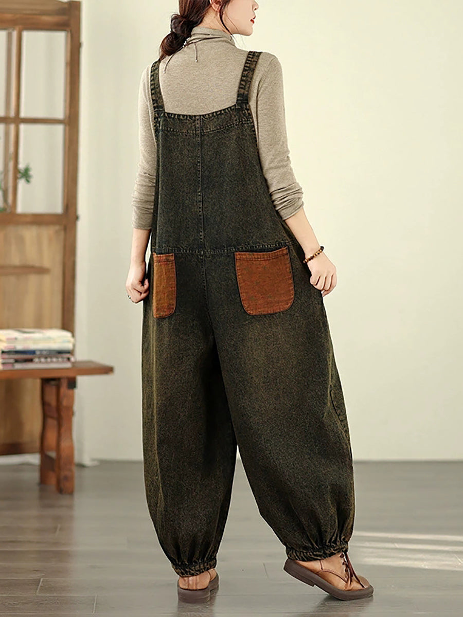 Women Vintage Patchwork Cotton Loose Denim Jumpsuits