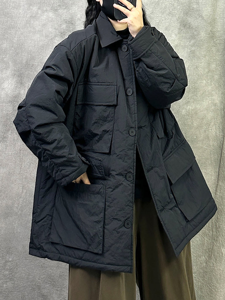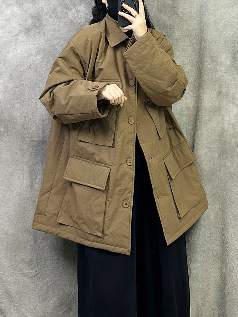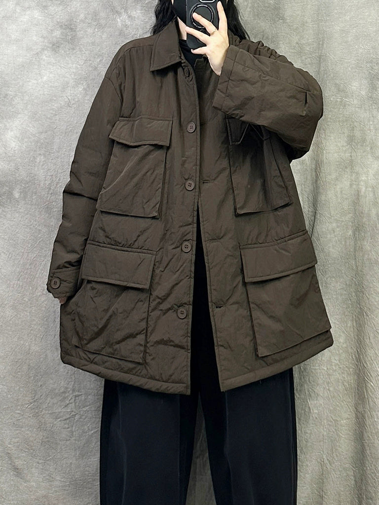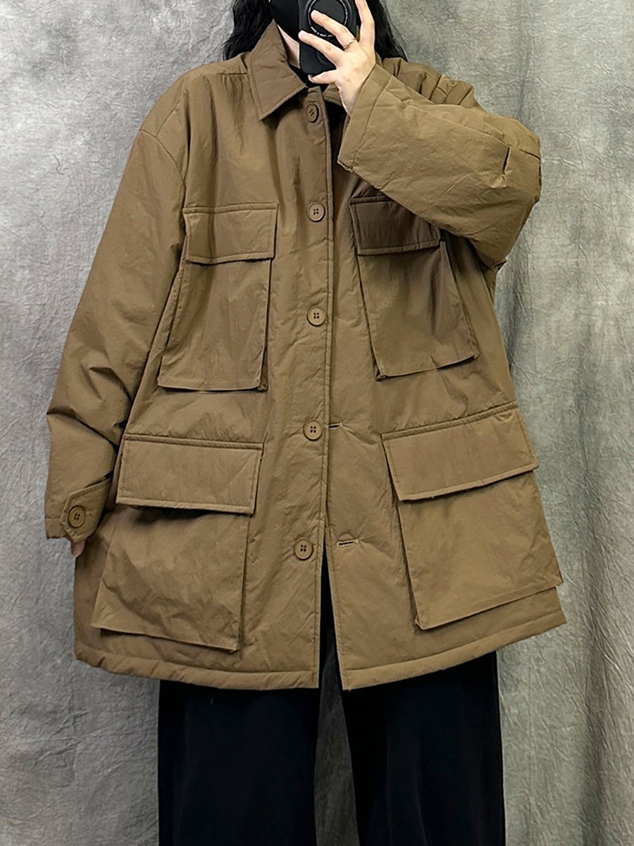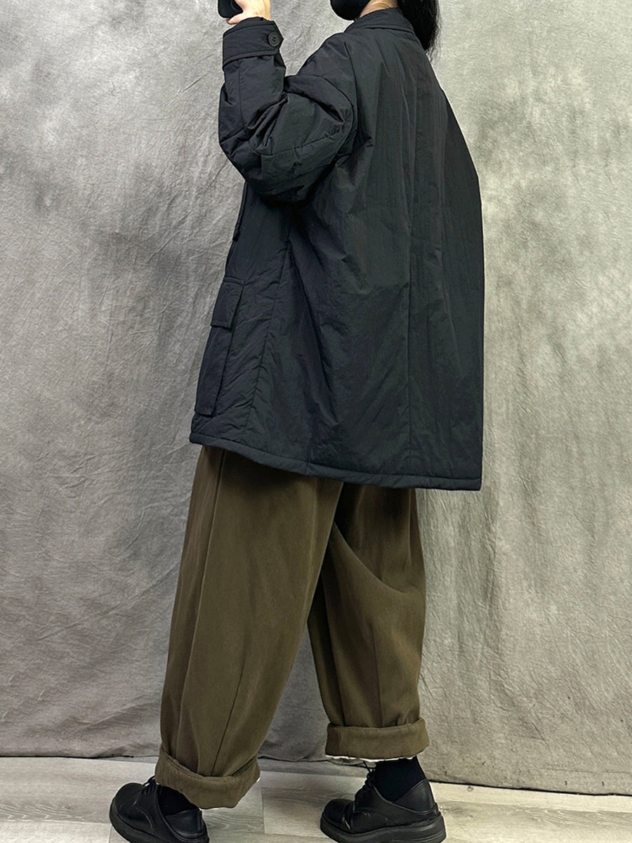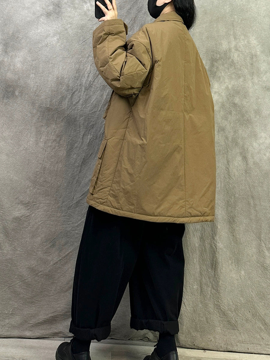 Women Vintage Pure Color Turn-down Collar Padded Coat