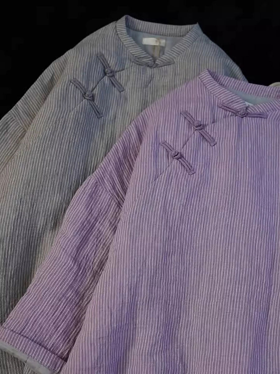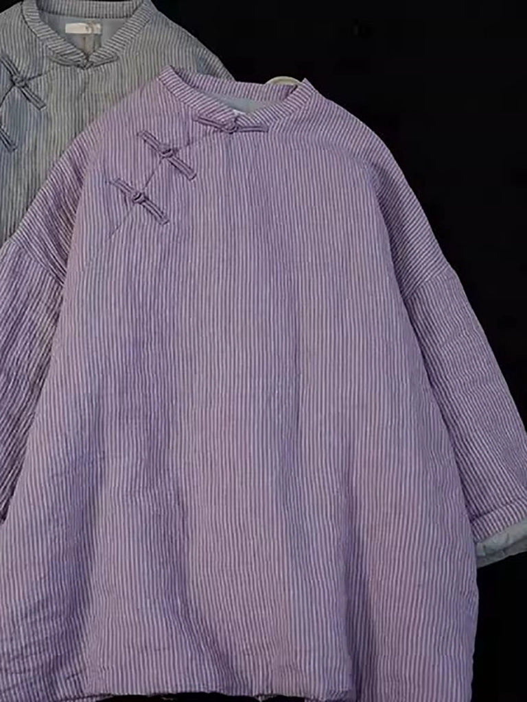Women Vintage Stripe Linen Stand Collar Padded Coat