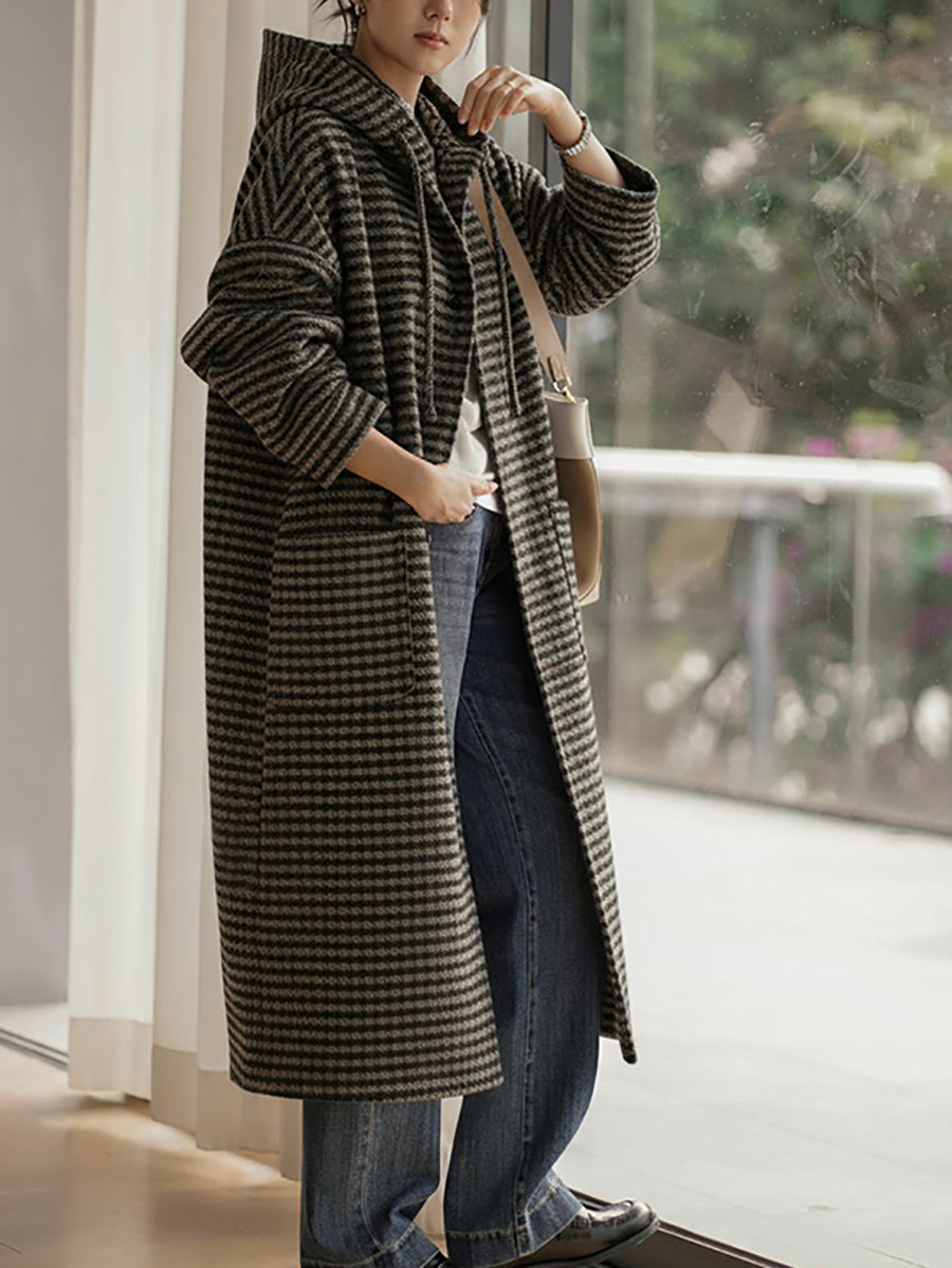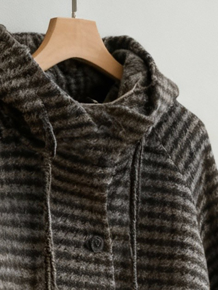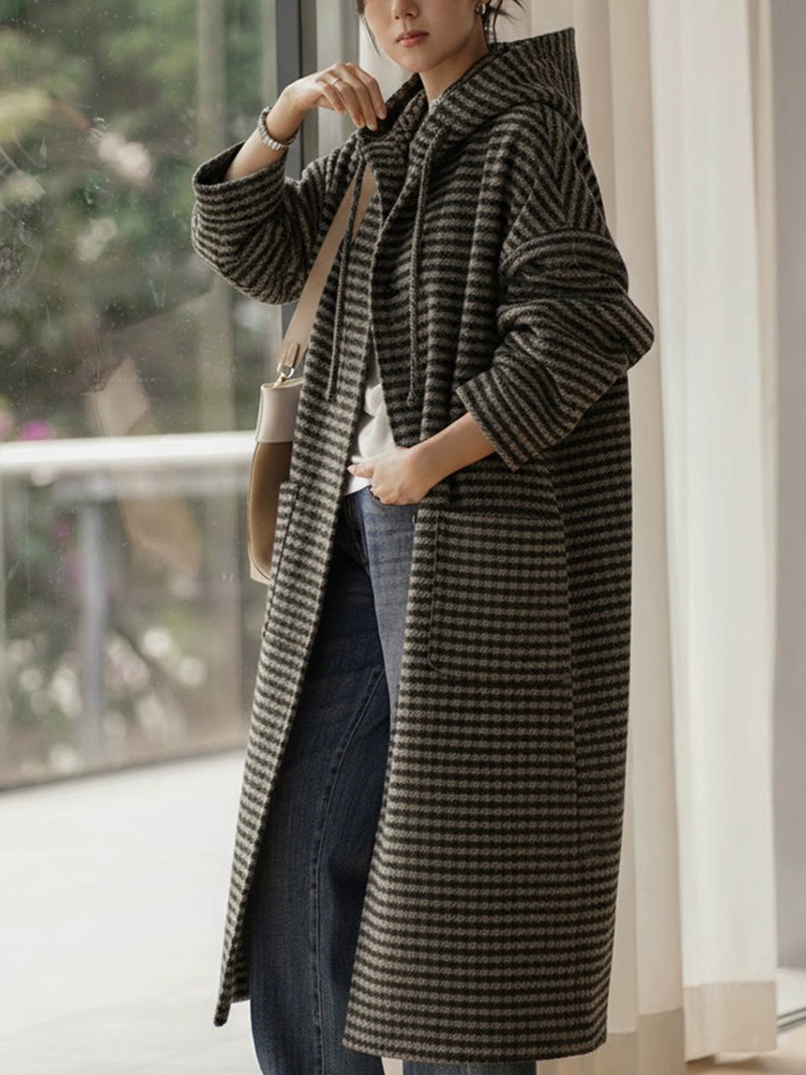 Women Vintage Winter Stripe Hooded Coat