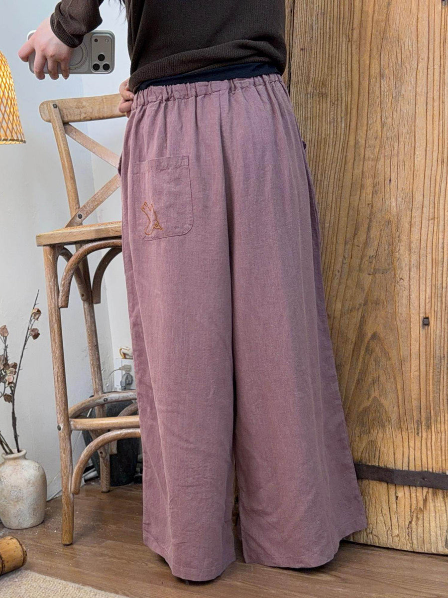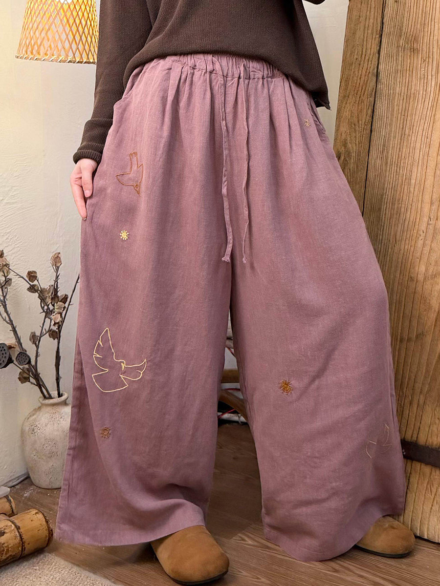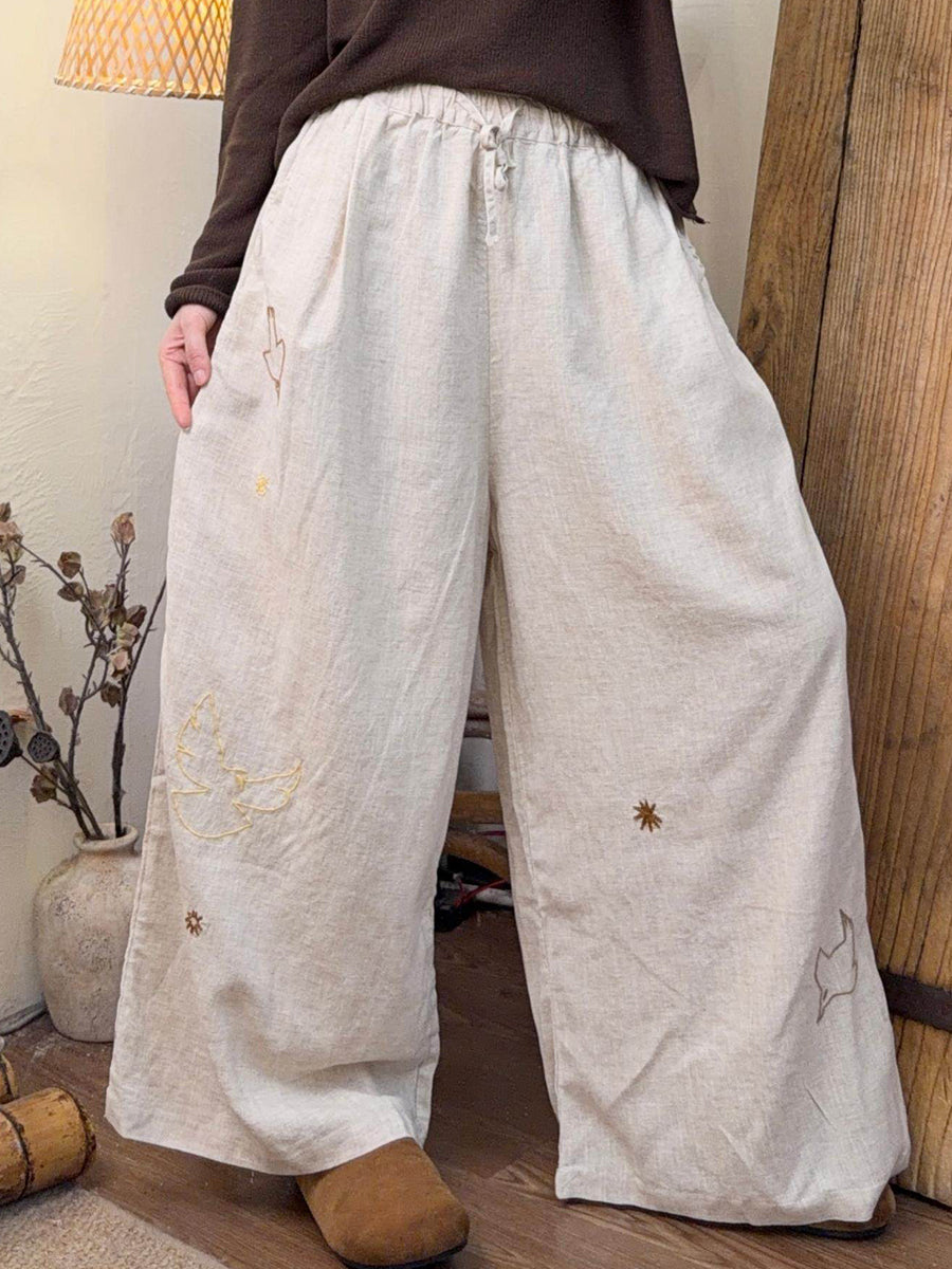 Women Winter Artsy Bird Embroidery Wide-leg Pants
