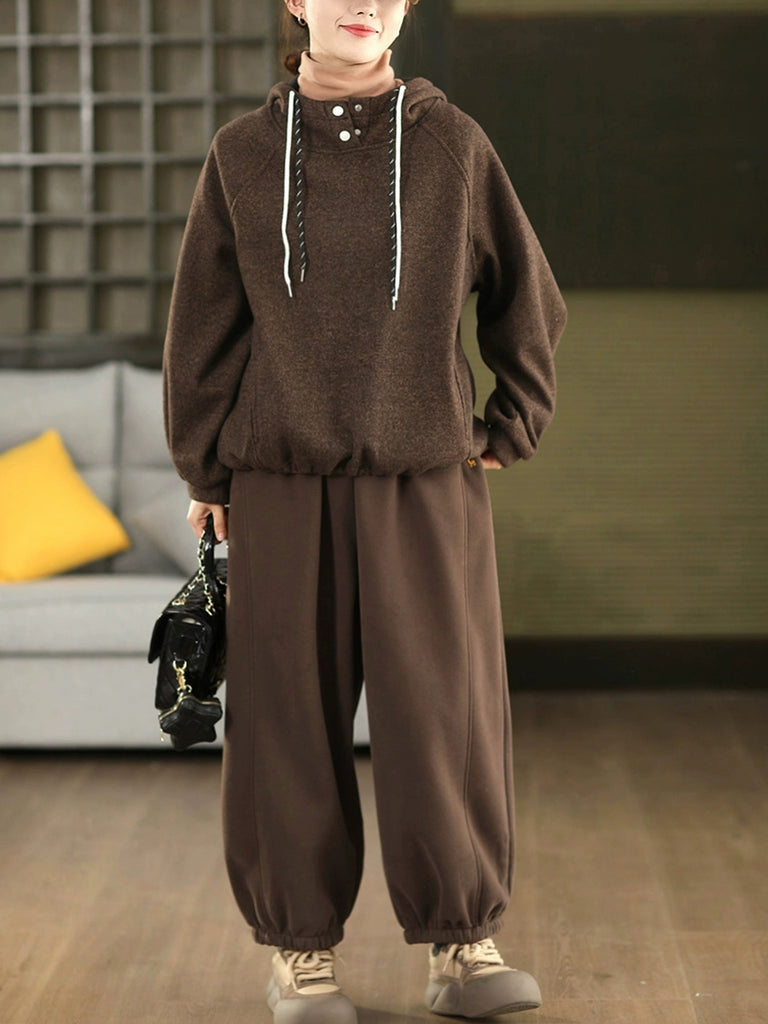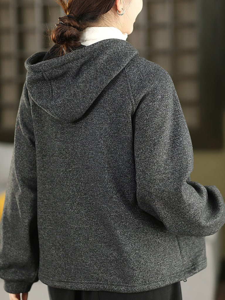 Women Winter Casual Pure Color Fleece-lined Hooded Blouse