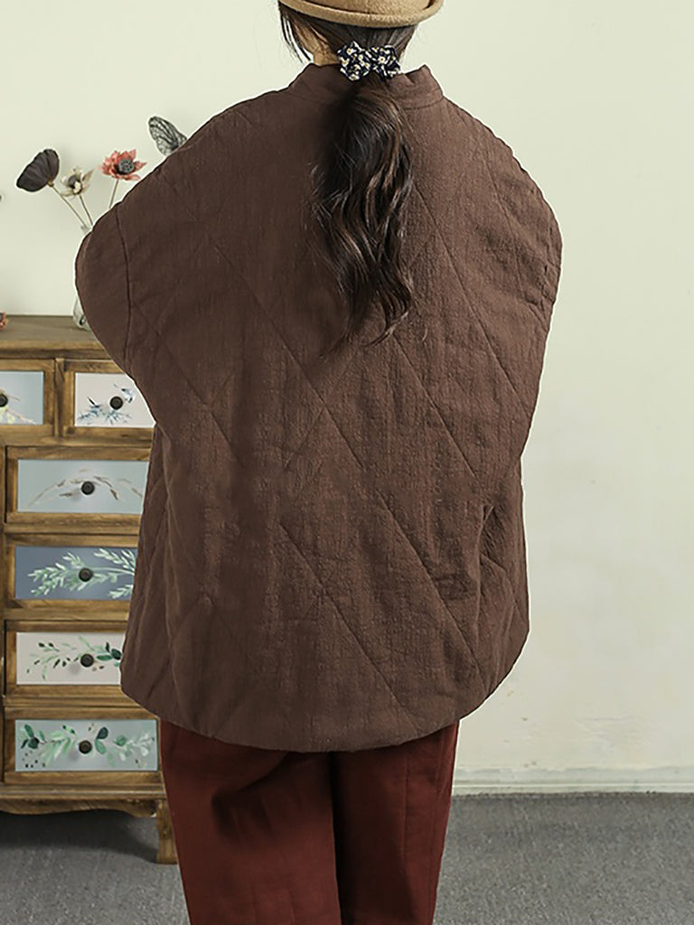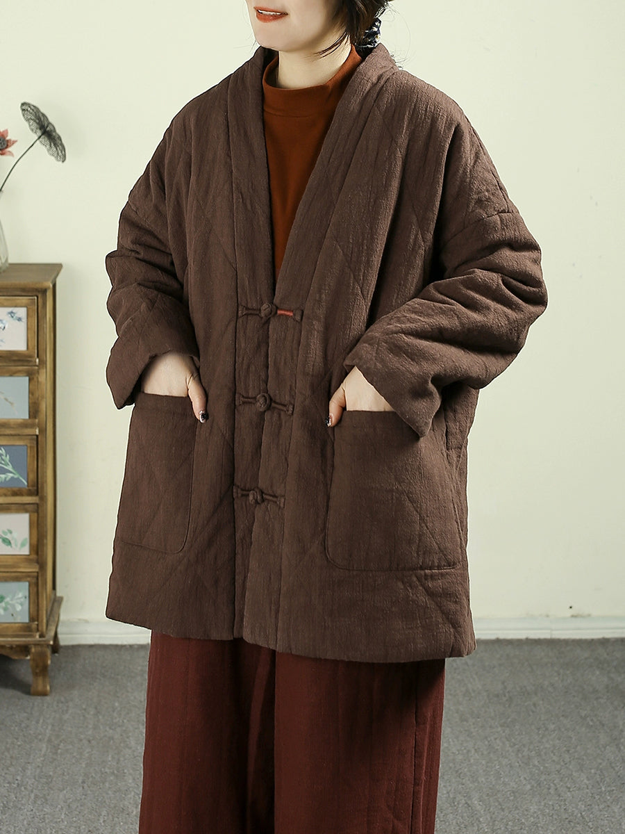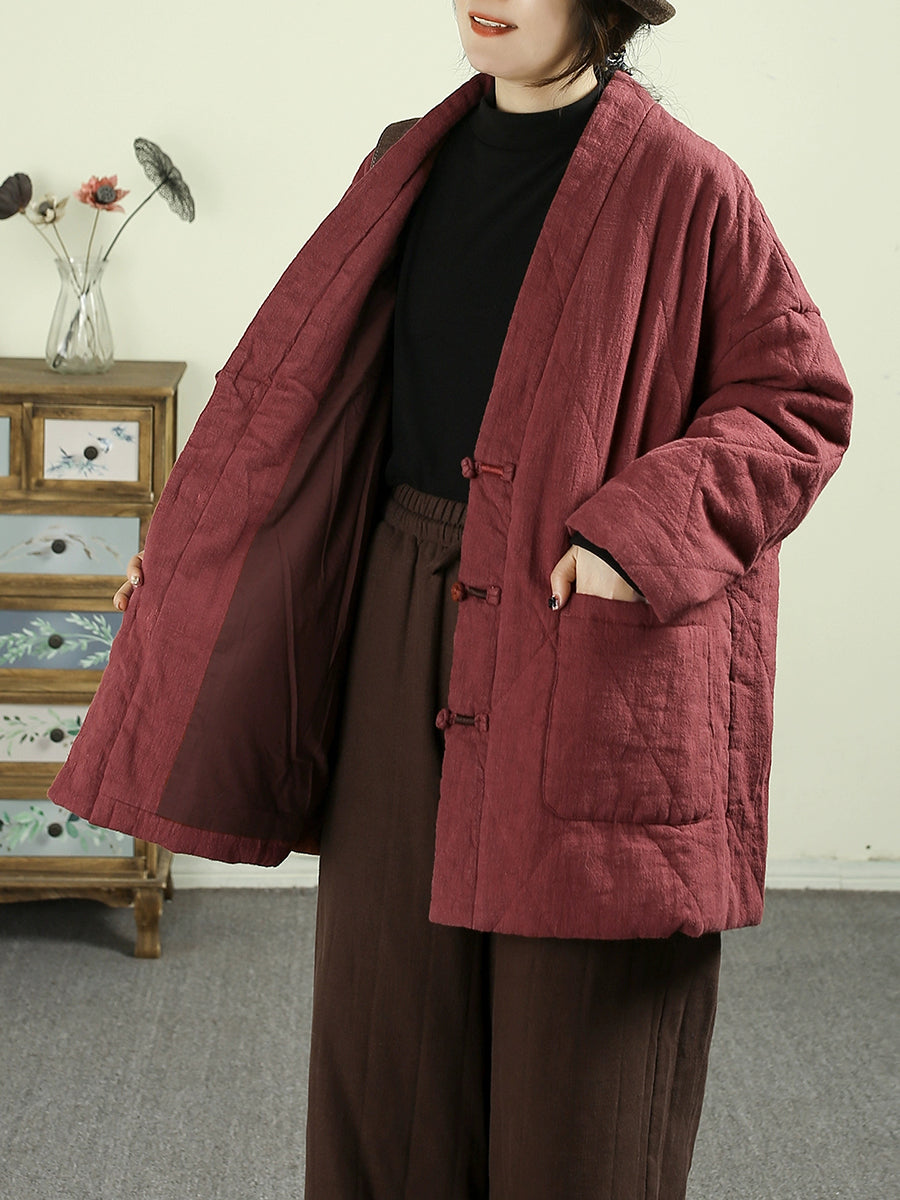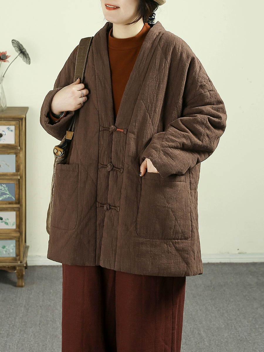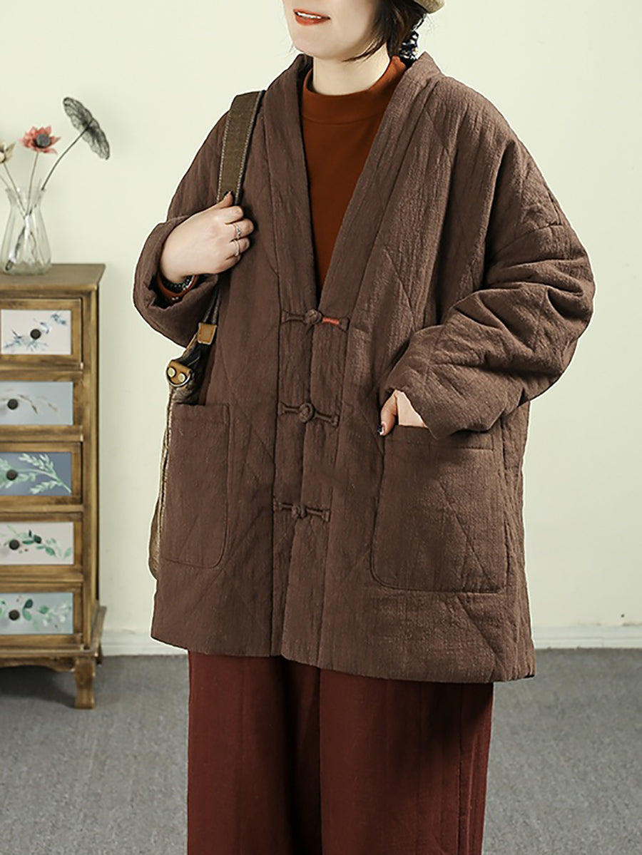 Women Winter Casual Pure Color Linen V-Neck Padded Coat
