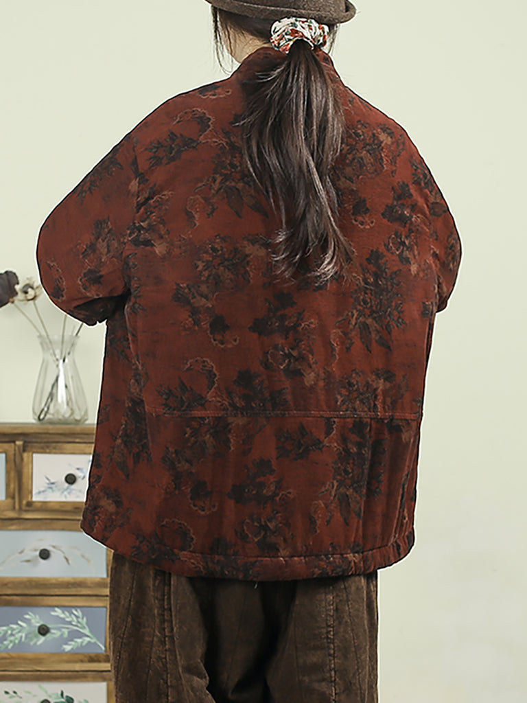 Crafted from linen, this padded coat features a floral pattern and a stand collar design. It offers full-length sleeves with a classic retro style, making it ideal for the autumn and winter seasons.