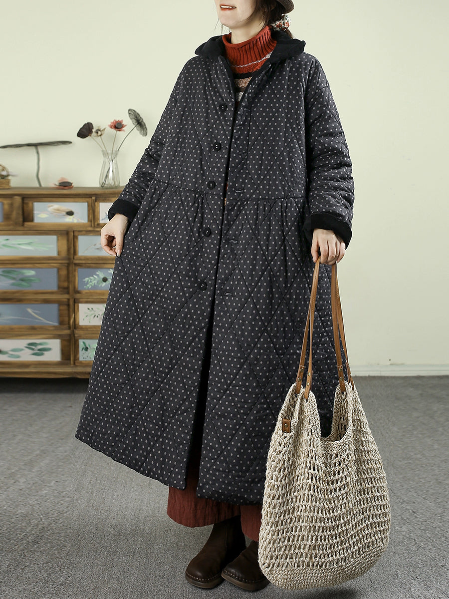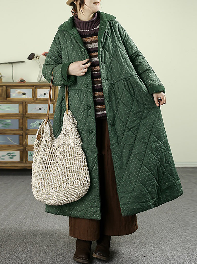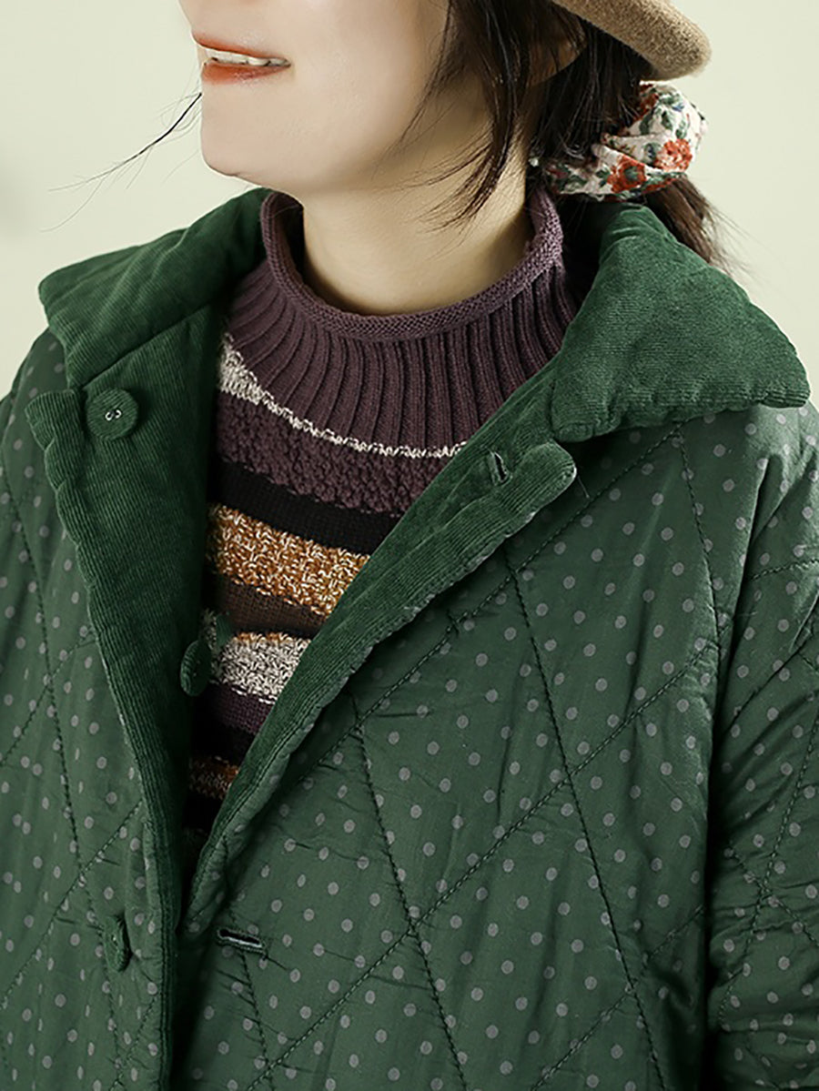 Crafted from premium cotton with a matching cotton lining, this winter essential delivers versatile seasonal styling. The classic turn-down collar and full-length regular sleeves provide timeless appeal, while the retro silhouette adds distinctive character. Available in solid hues and dotted patterns, the dual-side wearing design maximizes wardrobe flexibility. The padded corduroy construction offers superior insulation for autumn and winter wear, making it an indispensable layering piece for transitional weather.
