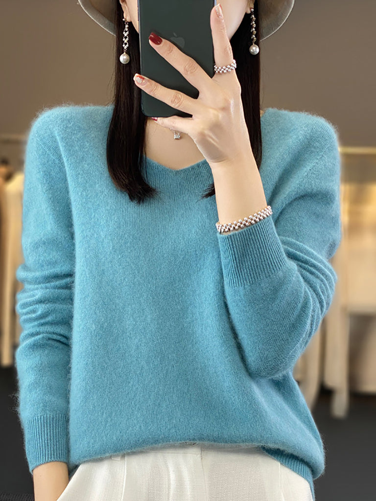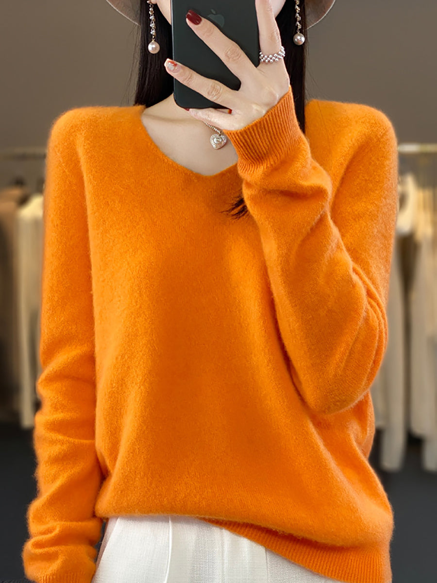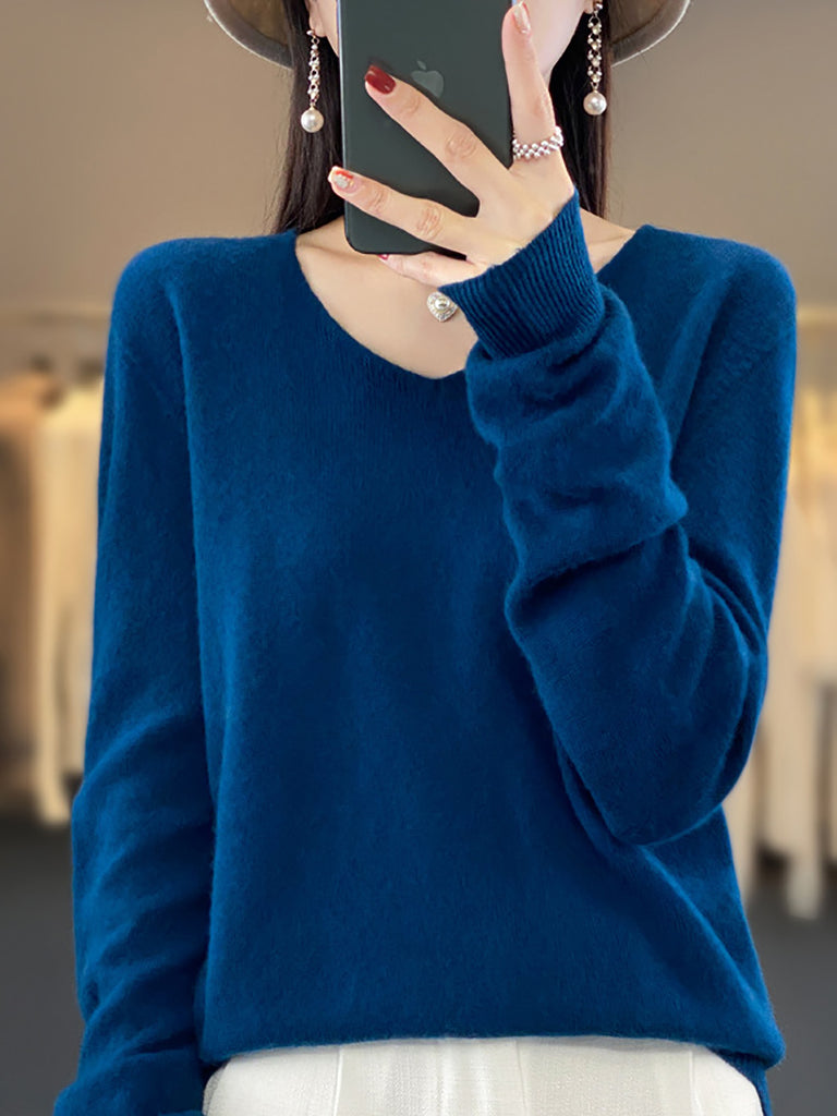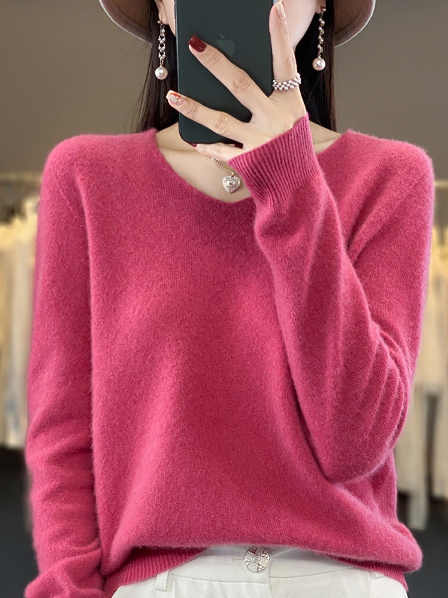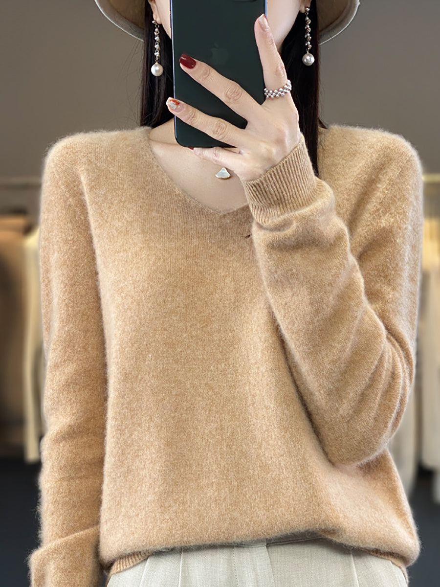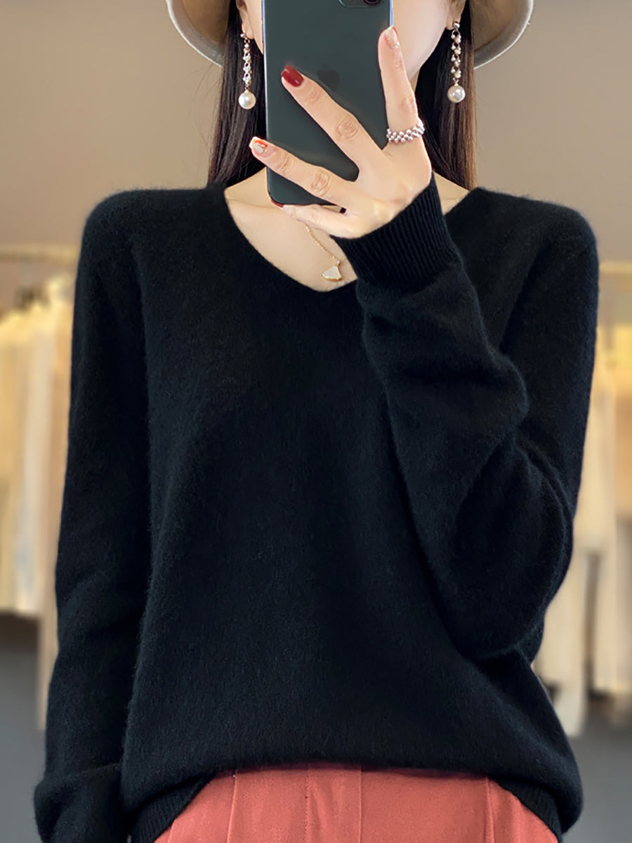 Women Winter Pure Color V-Neck Sweater